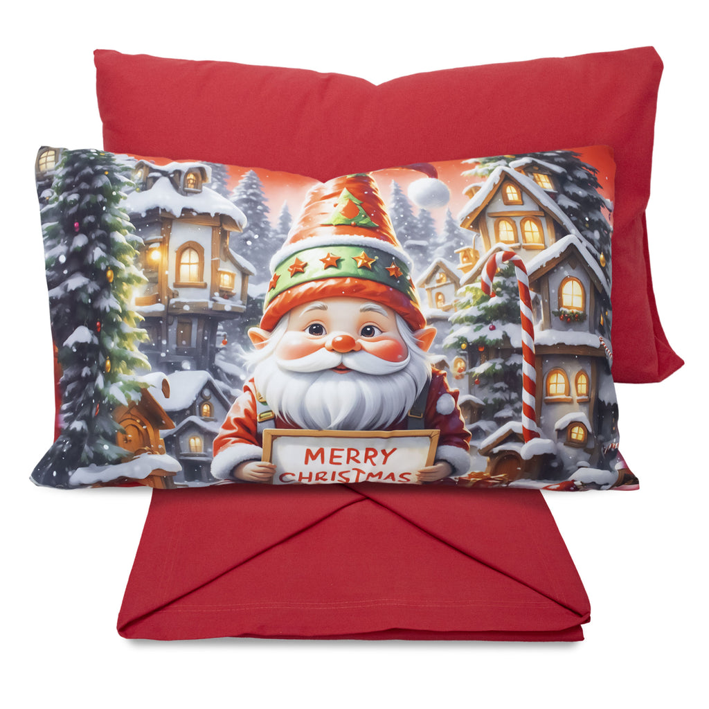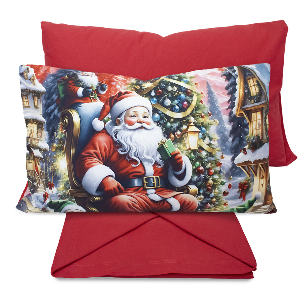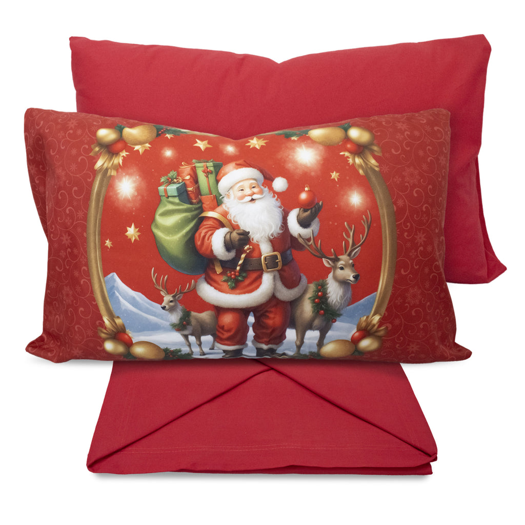 Das Set beinhaltet: ein Oberlaken mit den Maßen 250 x 290 cm, ein Unterlaken mit MAXI-Ecken mit den Maßen 175 x 200 cm und 4 Kissenbezüge. Zwei Kissenbezüge sind in einfarbigem Rot gehalten, während die anderen beiden, die kostenlos im Lieferumfang enthalten sind, mit einem raffinierten weihnachtlichen Digitaldruck versehen sind. Die Kombination aus Polyester und Baumwolle garantiert Weichheit, Widerstandsfähigkeit und einfache Pflege.
