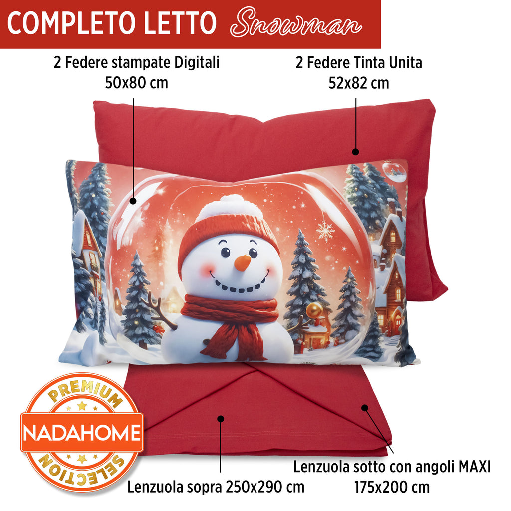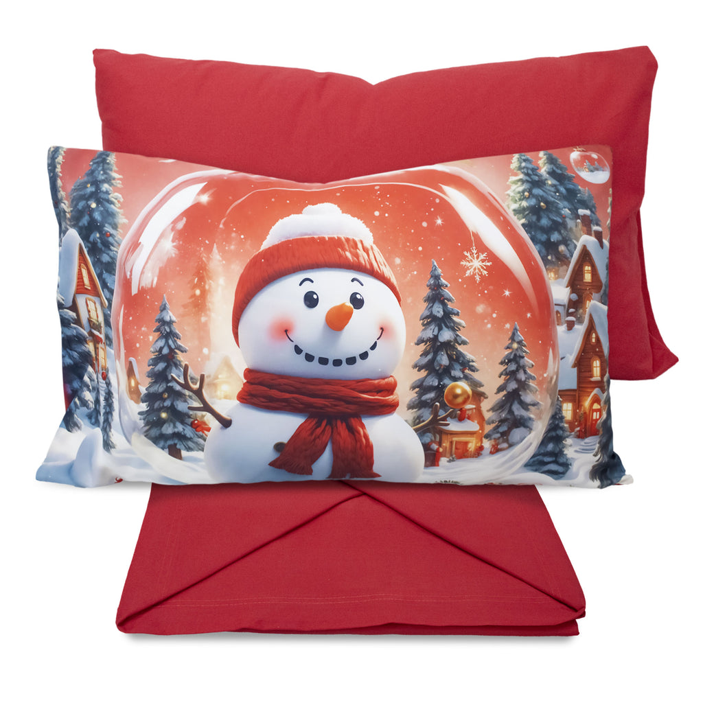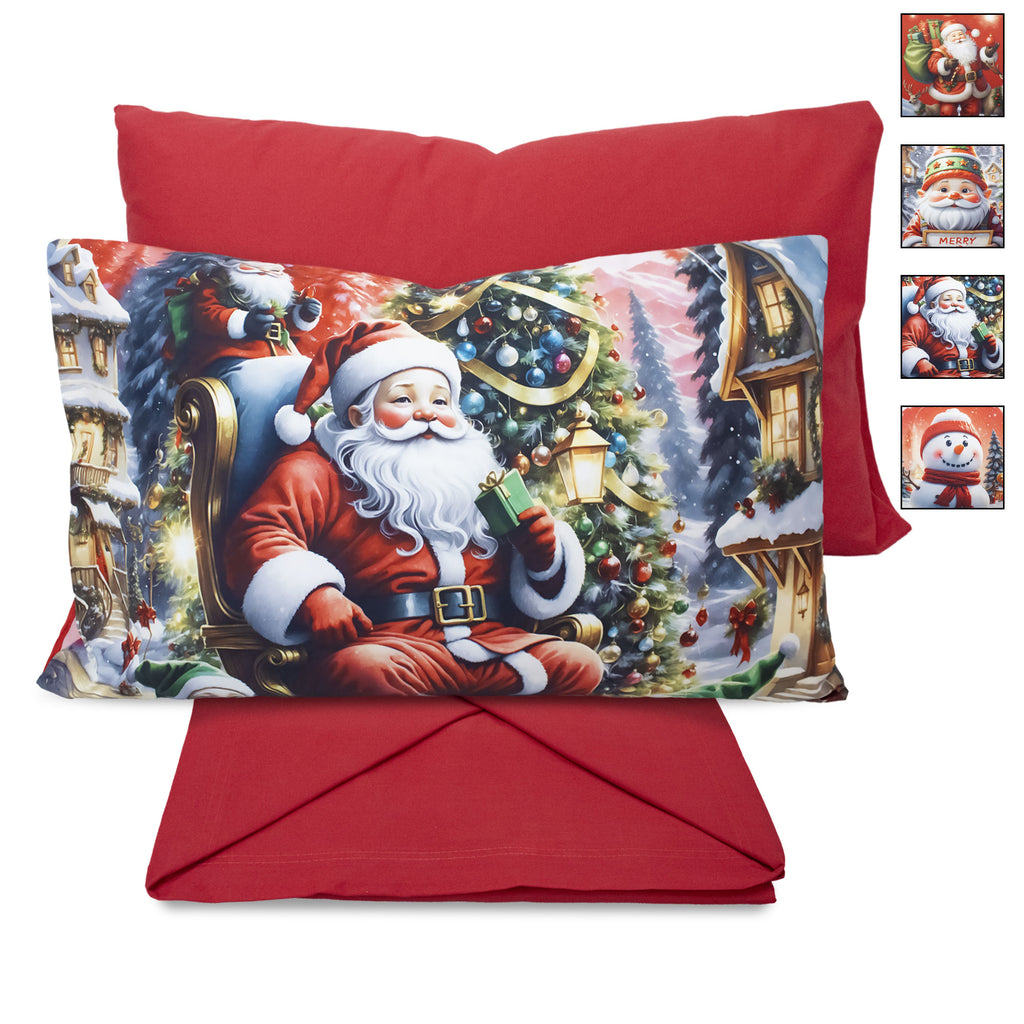 Das Set beinhaltet: ein Oberlaken mit den Maßen 250 x 290 cm, ein Unterlaken mit MAXI-Ecken mit den Maßen 175 x 200 cm und 4 Kissenbezüge. Zwei Kissenbezüge sind in einfarbigem Rot gehalten, während die anderen beiden, die kostenlos im Lieferumfang enthalten sind, mit einem raffinierten weihnachtlichen Digitaldruck versehen sind. Die Kombination aus Polyester und Baumwolle garantiert Weichheit, Widerstandsfähigkeit und einfache Pflege.