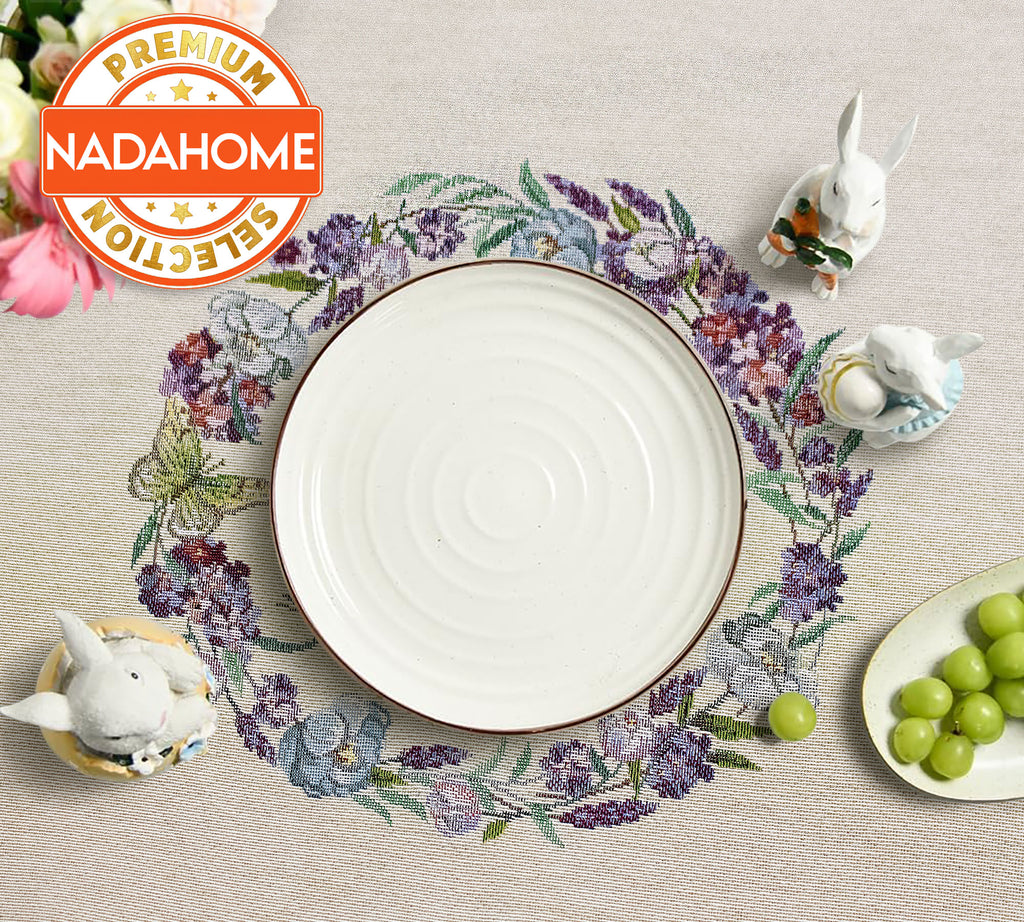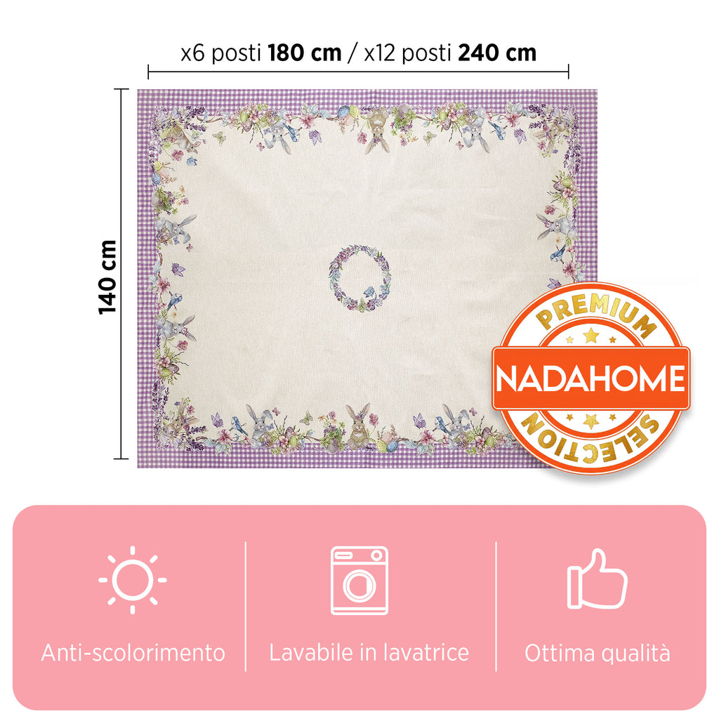 In der Mitte der Tischdecke sticht eine Blumengirlande hervor, die harmonisch auf das umgebende Blumenmotiv abgestimmt ist und für ein raffiniertes und faszinierendes Design sorgt. Perfekt, um Ihren Tisch während der Osterferien zu dekorieren oder Ihrem Zuhause einen frühlingshaften Touch zu verleihen.