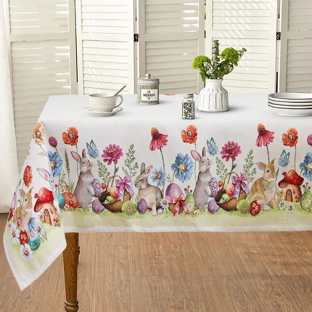 Das bezaubernde Muster mit verspielten Hasen, Blumen und Körben voller Ostereier verleiht Ihrem Tisch eine festliche und einzigartige Note. Mit seinen großzügigen Maßen von 140 x 180 cm passt er perfekt auf 6-Sitzer-Tische und macht jede Mahlzeit zu einem besonderen Anlass.