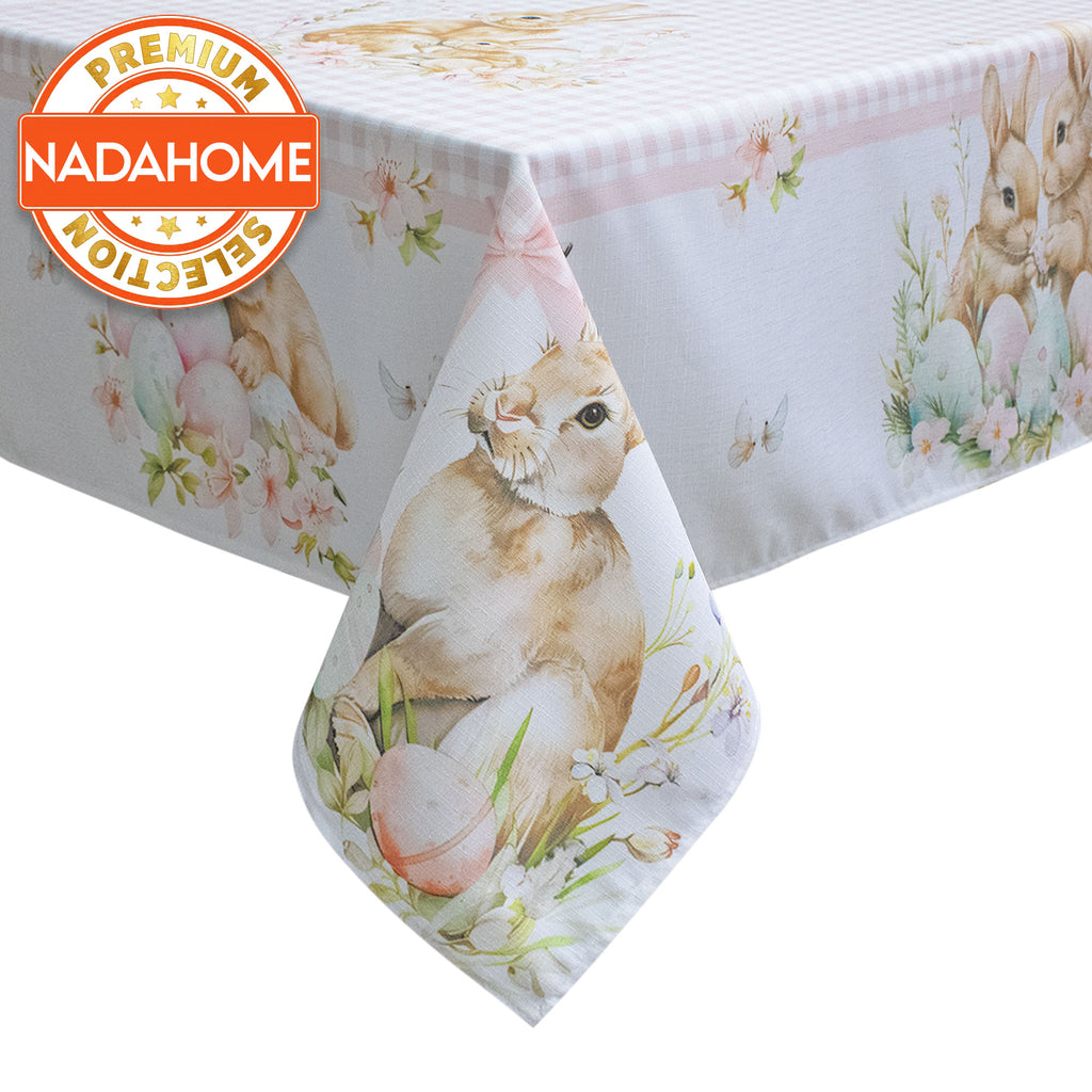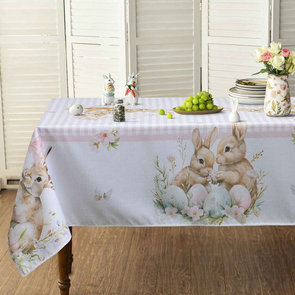 Machen Sie jeden Ostermoment unvergesslich mit unserer Tischdecke, die mit einem raffinierten Digitaldruck verziert ist, der die Frühlingszeit feiert: Süße Hasen, bunte Eier und kleine Blumen verflechten sich mit Pastellfarben in einem zentralen Gingham-Muster und sorgen für eine elegante und einladende Atmosphäre.