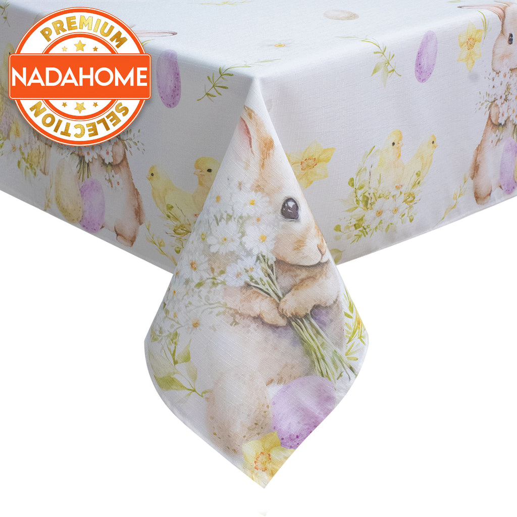 Machen Sie jeden Ostermoment unvergesslich mit unserer Tischdecke, die mit einem raffinierten Digitaldruck verziert ist, der die Frühlingszeit feiert: süße Hasen mit Blumensträußen, bunte Eier, Küken in Körben und kleine Blumen verflechten sich in Pastellfarben und sorgen für eine elegante und einladende Atmosphäre.