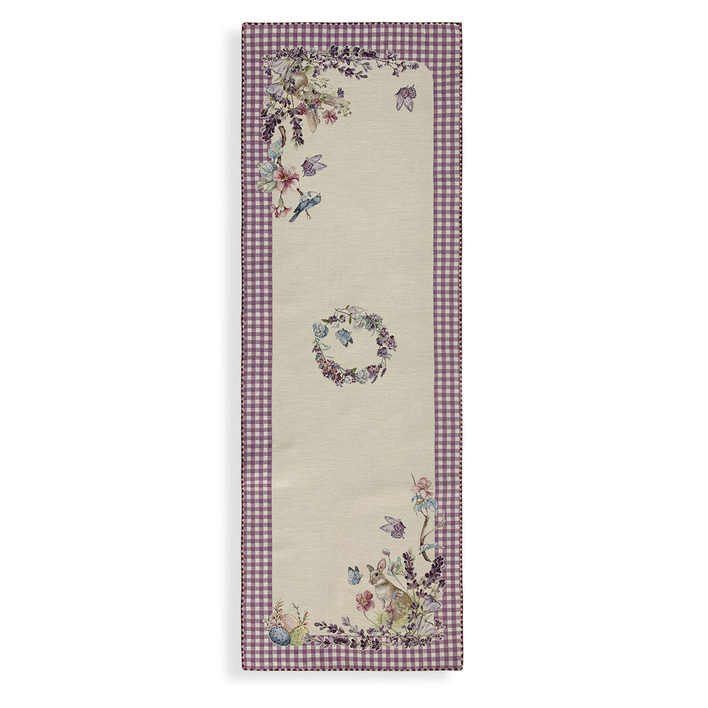 Der Läufer besteht aus hochwertiger Gobelin-Baumwolle und eignet sich dank des Musters mit Hasen, Vögeln, Schmetterlingen, Blumen und Gingham-Bordüre perfekt für die Schaffung einer einladenden und festlichen Atmosphäre während der Osterfeiertage.