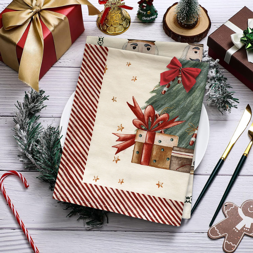 Die cremefarbene Basis bietet eine verlockende Leinwand für die Weihnachtsgestaltung. Der rot gestreifte Rand verleiht einen Hauch von Eleganz und Tradition, während in der Mitte ein prächtig mit Geschenkpaketen geschmückter Weihnachtsbaum mit einer roten Schleife an der Spitze, Nussknackern und einem Hintergrund aus goldenen Sternen steht. Dieses bezaubernde Arrangement fängt die Weihnachtsstimmung perfekt ein.