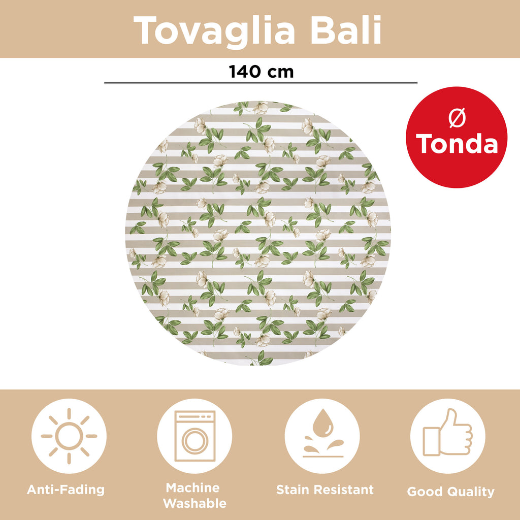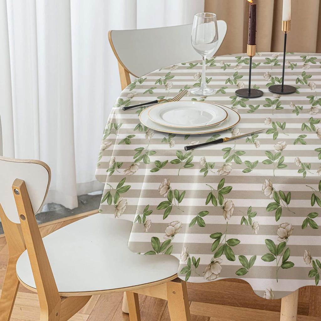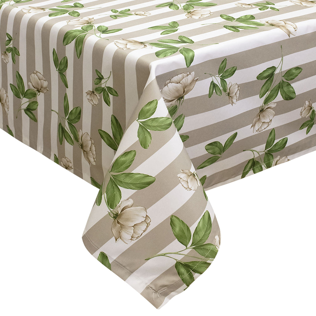 Verleihen Sie Ihrem Tisch einen Hauch von Eleganz mit unserer schmutzabweisenden Tischdecke mit raffiniertem Blumenmuster. Auf einem taubengrauen Hintergrund mit horizontalen Streifen stechen prächtige Pfingstrosen hervor, die einen zarten und harmonischen visuellen Effekt erzeugen. Perfekt, um jedem Anlass Stil und Klasse zu verleihen, sei es ein informelles Abendessen oder ein besonderer Anlass.
