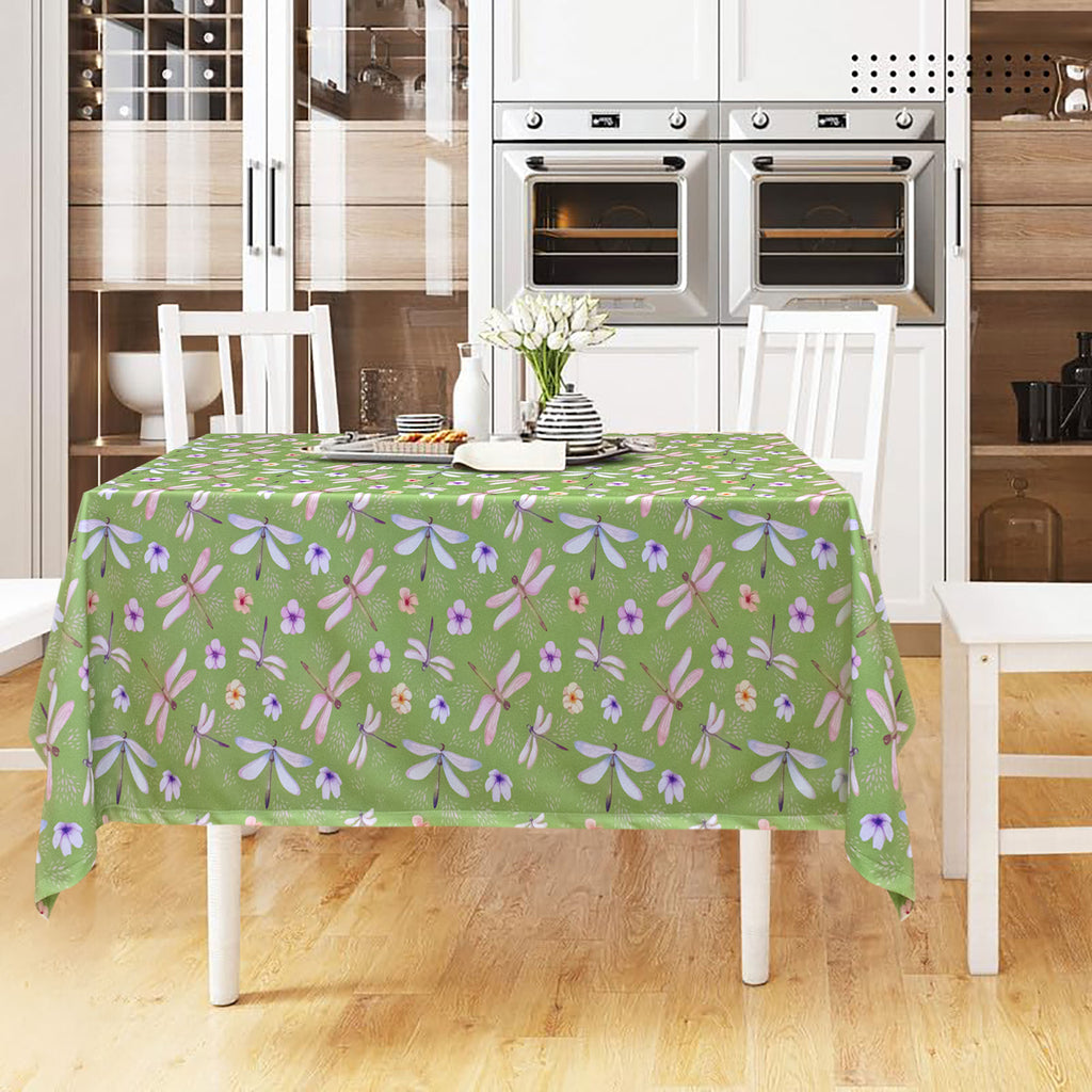 Verleihen Sie Ihrem Tisch einen Hauch von Frische und Stil mit unserer quadratischen, schmutzabweisenden Tischdecke, ideal für alle, die Eleganz und Zweckmäßigkeit in Umgebungen wie Restaurants, Hotels und B&Bs suchen. Die Tischdecke ist mit einem zarten Druck aus Libellen und kleinen Blumen auf grünem Hintergrund versehen, der eine natürliche und entspannte Atmosphäre schafft.