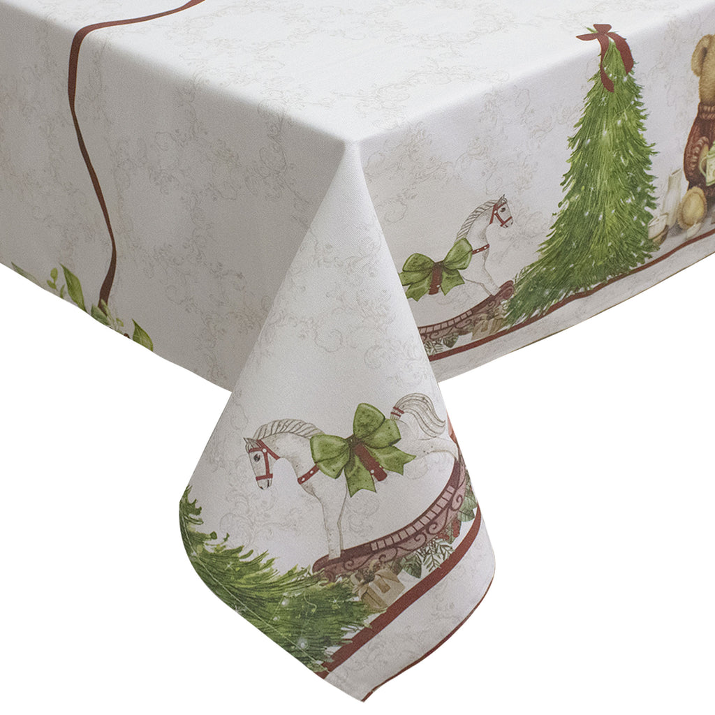 Die Tischdecke verfügt über einen wunderschönen Aufdruck in der Mitte einer Schleifengirlande, die mit Weihnachtsschmuck, kleinen Bäumen, Schaukelpferden und festlichen Bären bereichert ist und Sie und Ihre Gäste direkt in den Weihnachtszauber entführt.
