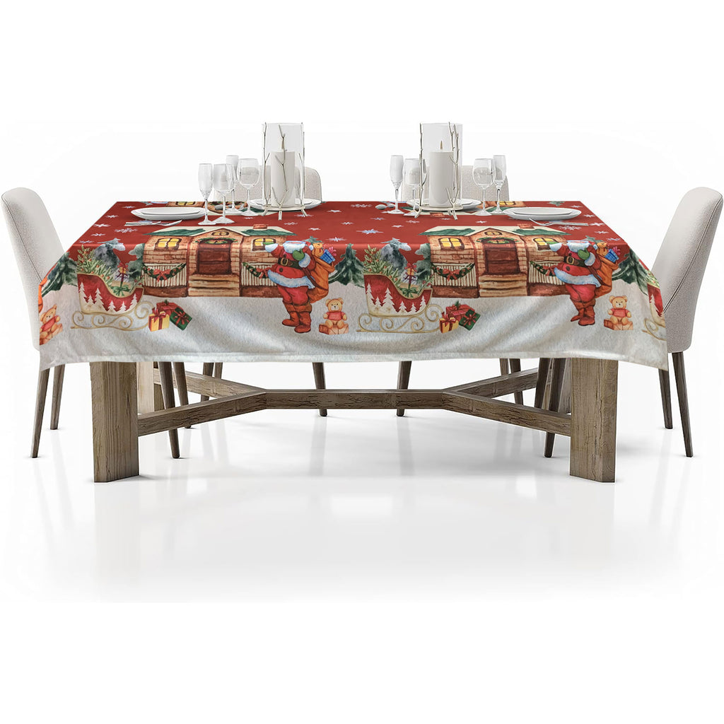 Die 140 x 180 cm große Tischdecke besteht aus einem besonders schmutzabweisenden Stoff, wodurch sie perfekt für den täglichen Gebrauch geeignet ist. Der Aufdruck mit Weihnachtsmotiven, kleinen Häusern und einem süßen Weihnachtsmann mit seinem Schlitten verleiht der Umgebung eine festliche Note.