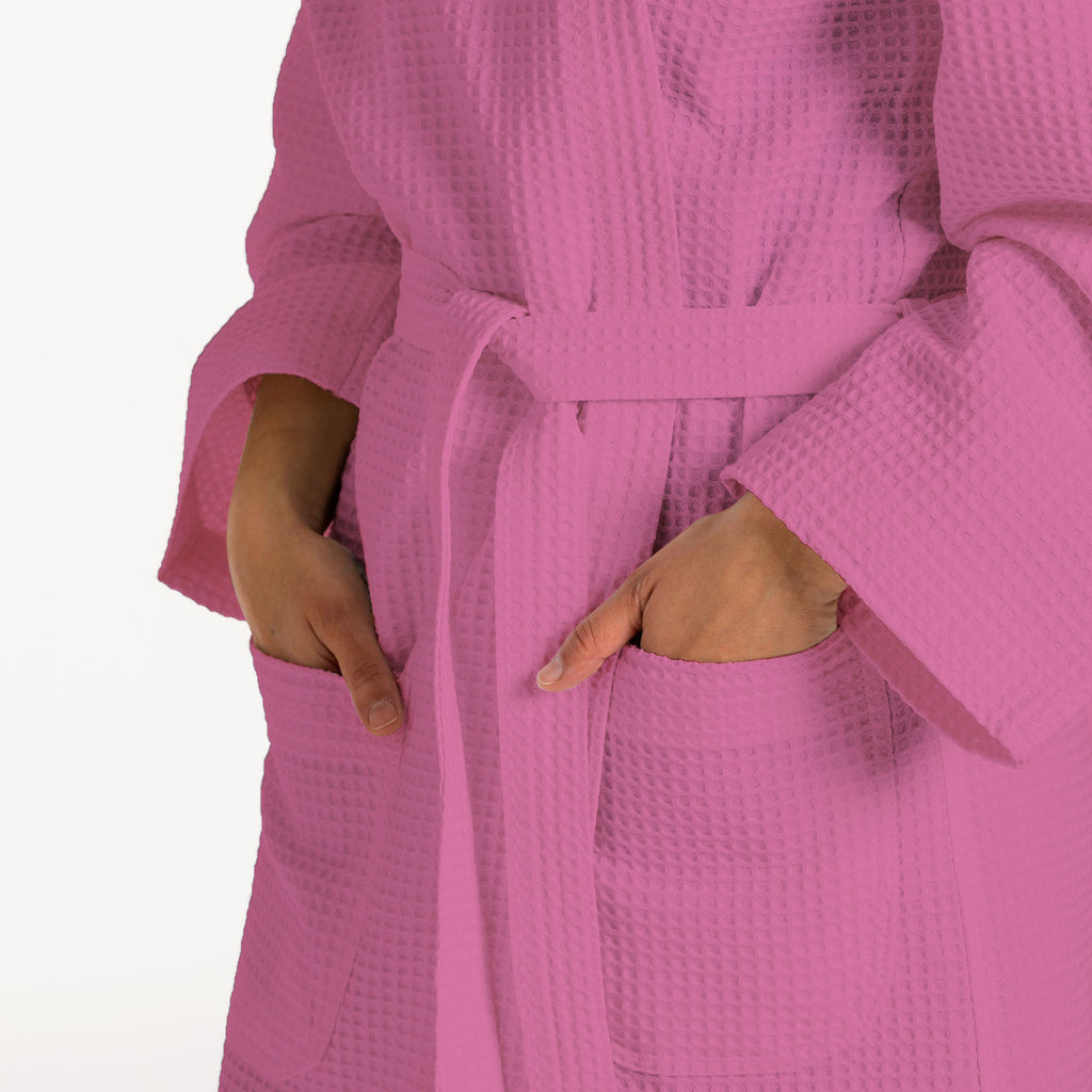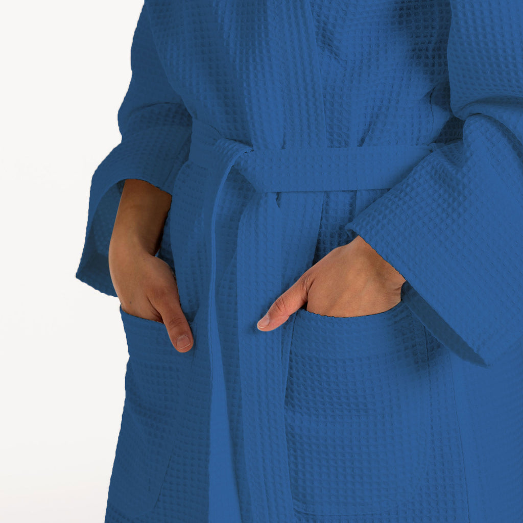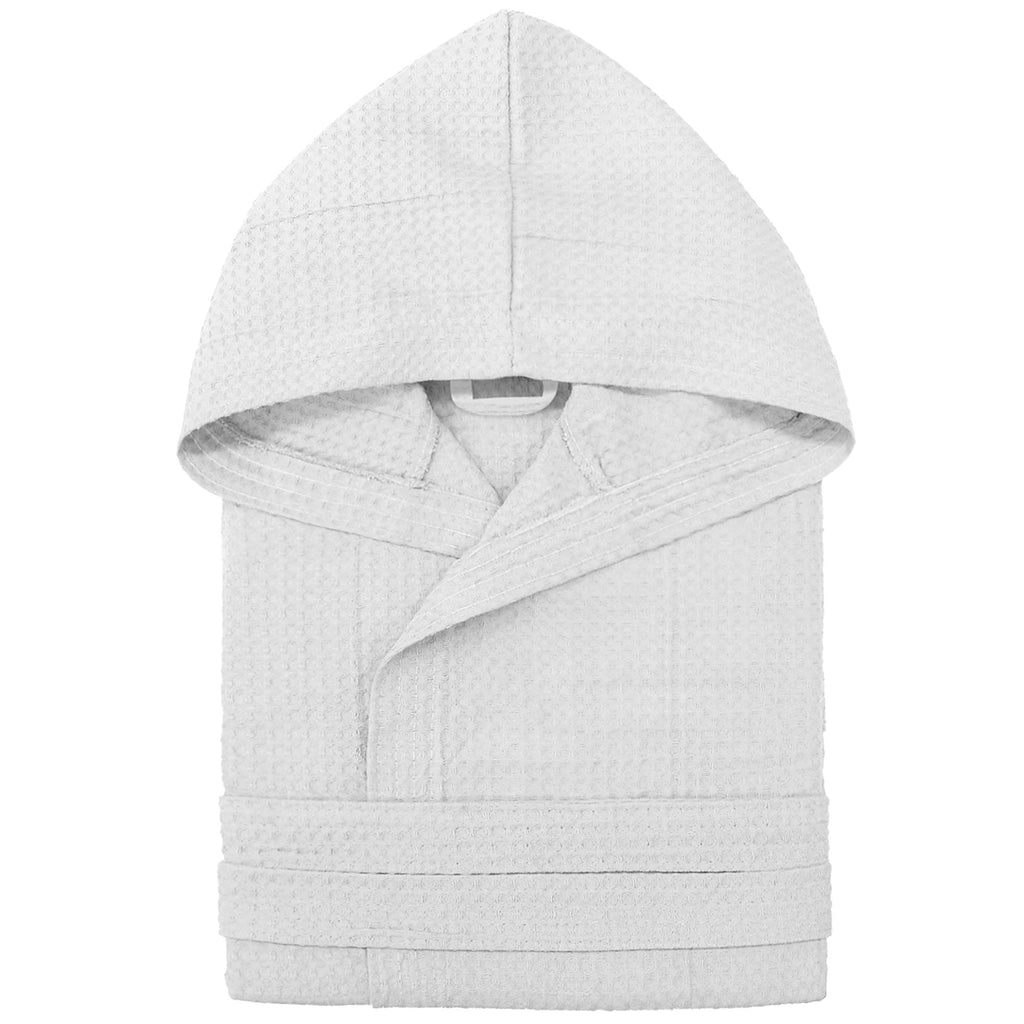 Unisex honeycomb bathrobe, ideal for men and women, with hood, two practical pockets and waist belt with belt loops for a comfortable fit.