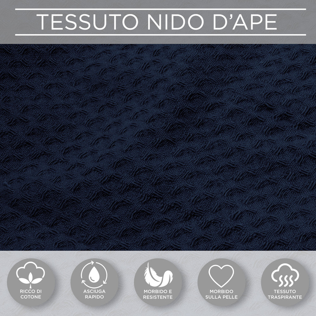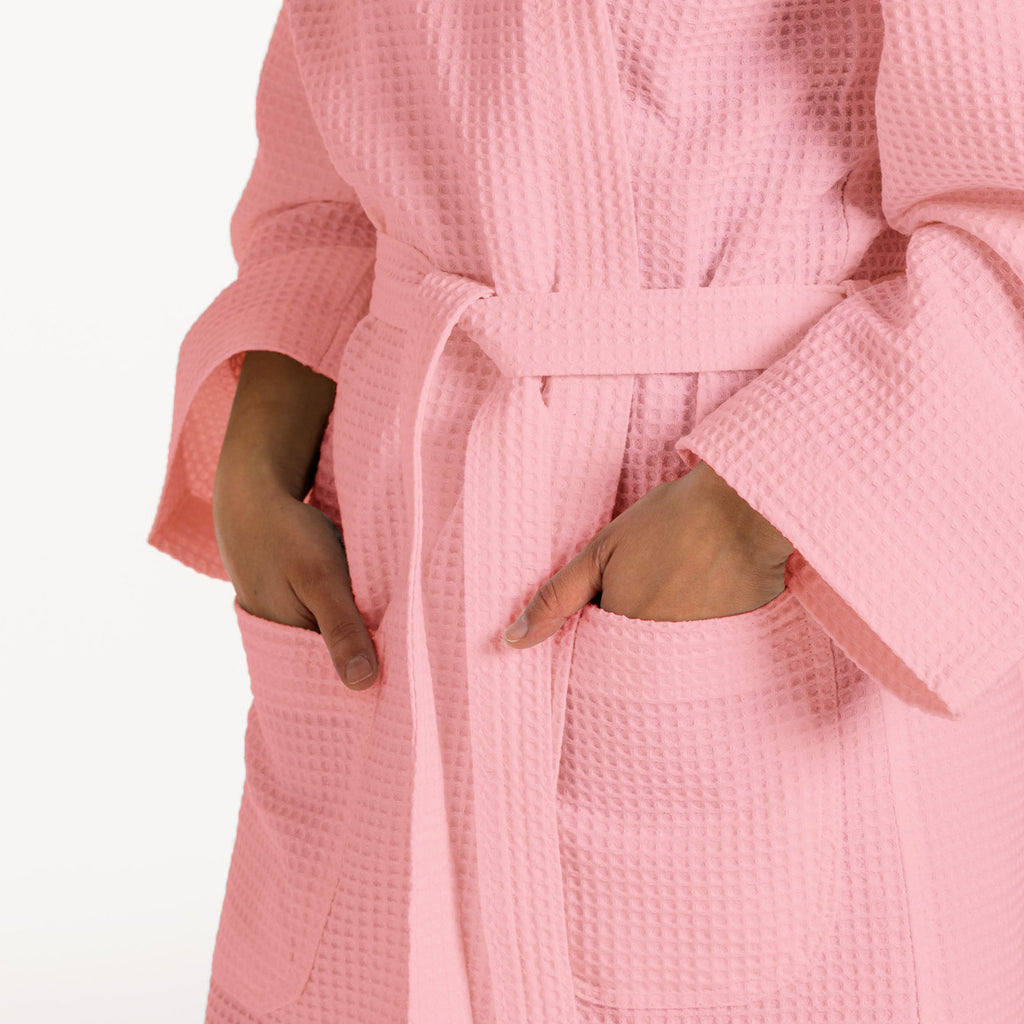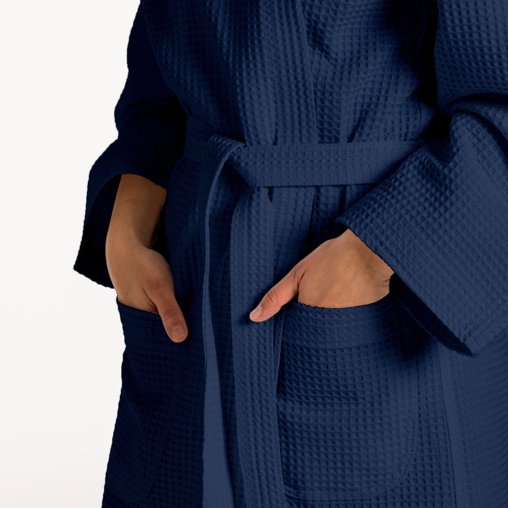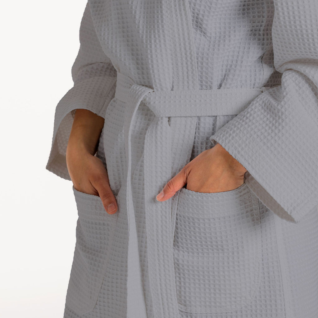 Unisex honeycomb bathrobe, ideal for men and women, with hood, two practical pockets and waist belt with belt loops for a comfortable fit.
