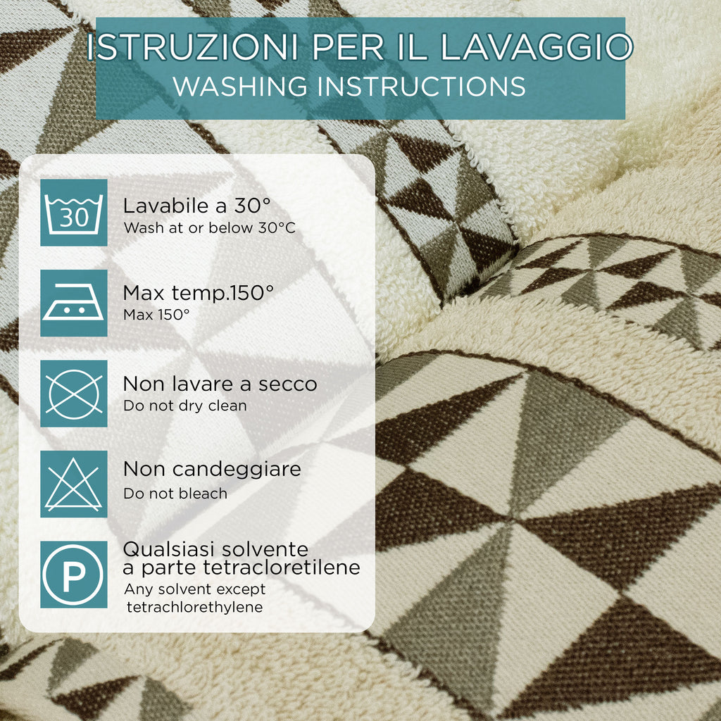 Le asciugamani sono impreziosite da un raffinato motivo geometrico ricamato, aggiungendo un tocco di eleganza e stile al tuo bagno. Realizzato in 100% cotone di alta qualità, questo set garantisce una morbidezza e un'assorbenza eccezionali, rendendo ogni utilizzo un vero piacere. Disponibile in diverse varianti di colore, per adattarsi al meglio al tuo gusto e all'arredamento del tuo bagno.