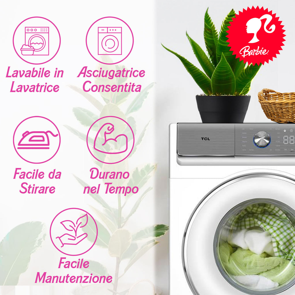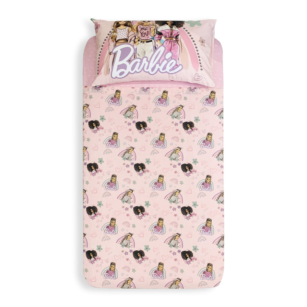 The set includes everything you need to create a cozy and comfortable environment: a fitted sheet with "Barbie" writing, which adapts perfectly to your single mattress.