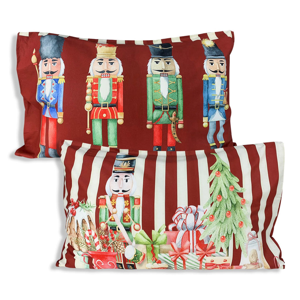 Both pillowcases are printed, one plain depicting nutcrackers and the other striped with a nutcracker and Christmas decorations.