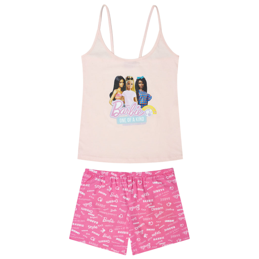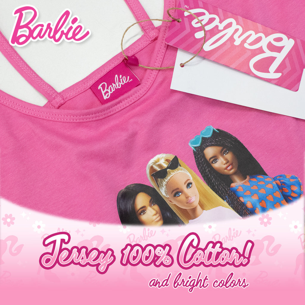 The top is a comfortable tank top with straps, decorated with a print of three Barbie dolls and the words "Barbie – One of a Kind," designed for those who love to stand out even when relaxing. Feminine, trendy, and super fashionable!