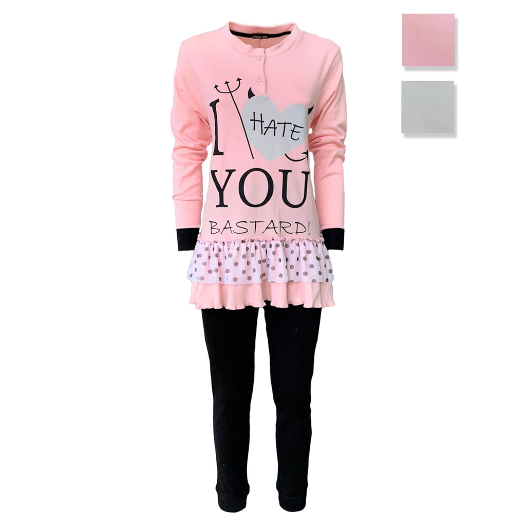 Crew-neck sweater closed on the front with buttons, "I Hate you bastard!" print, cuffs on the sleeves and polka dot flounce on the bottom.