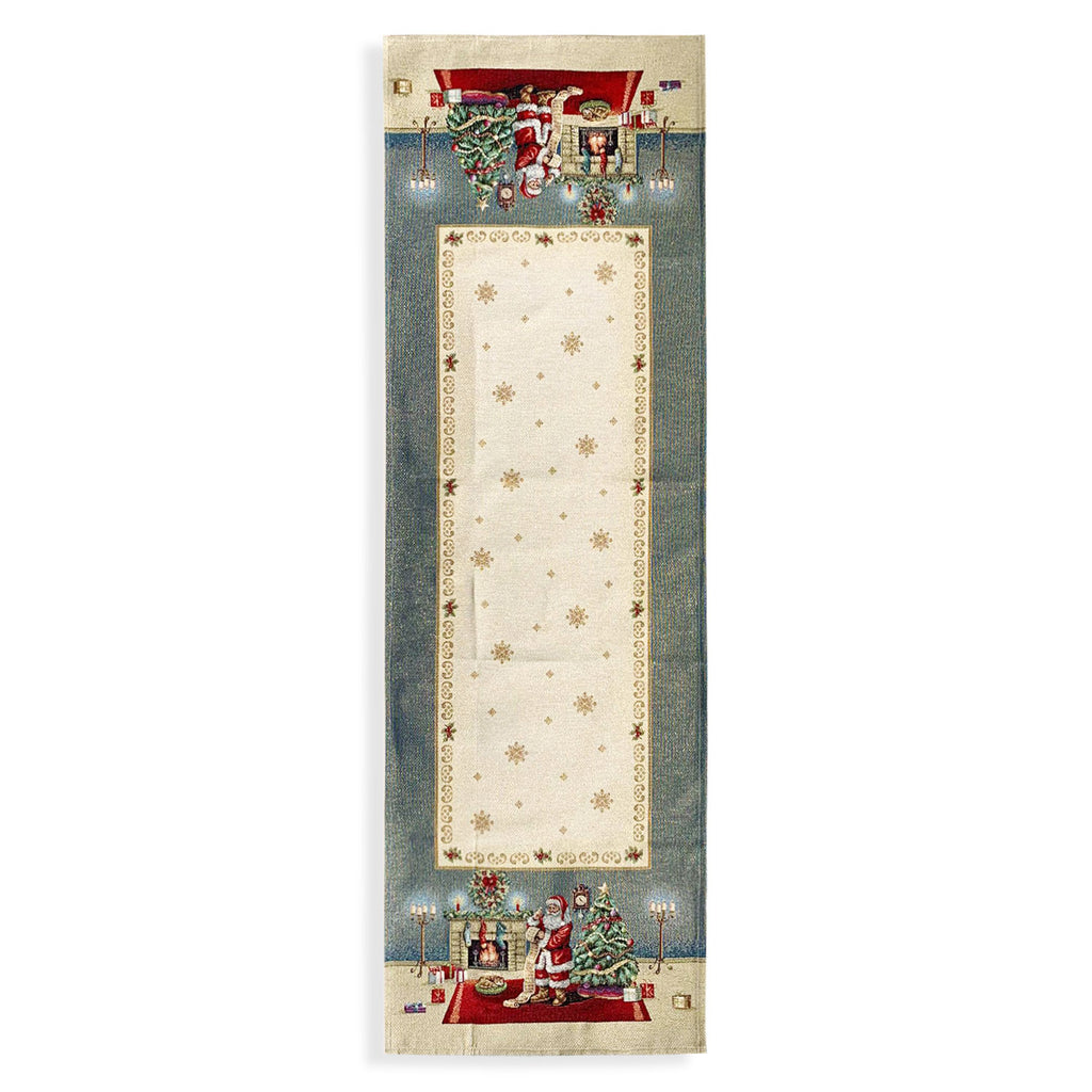 Runner in gobelin fabric with Christmas glitter Maestri Cotonieri patterned with Santa Claus and Christmas gifts.