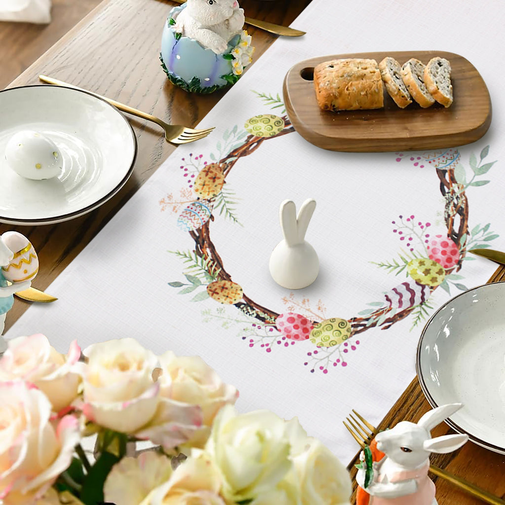 The enchanting pattern with a crown of flowers and eggs in the center and rabbits, baskets, flowers and Easter eggs at the end adds a festive and unique touch to your table. Every detail is expertly crafted, creating a work of textile art that captures the spirit of Easter.