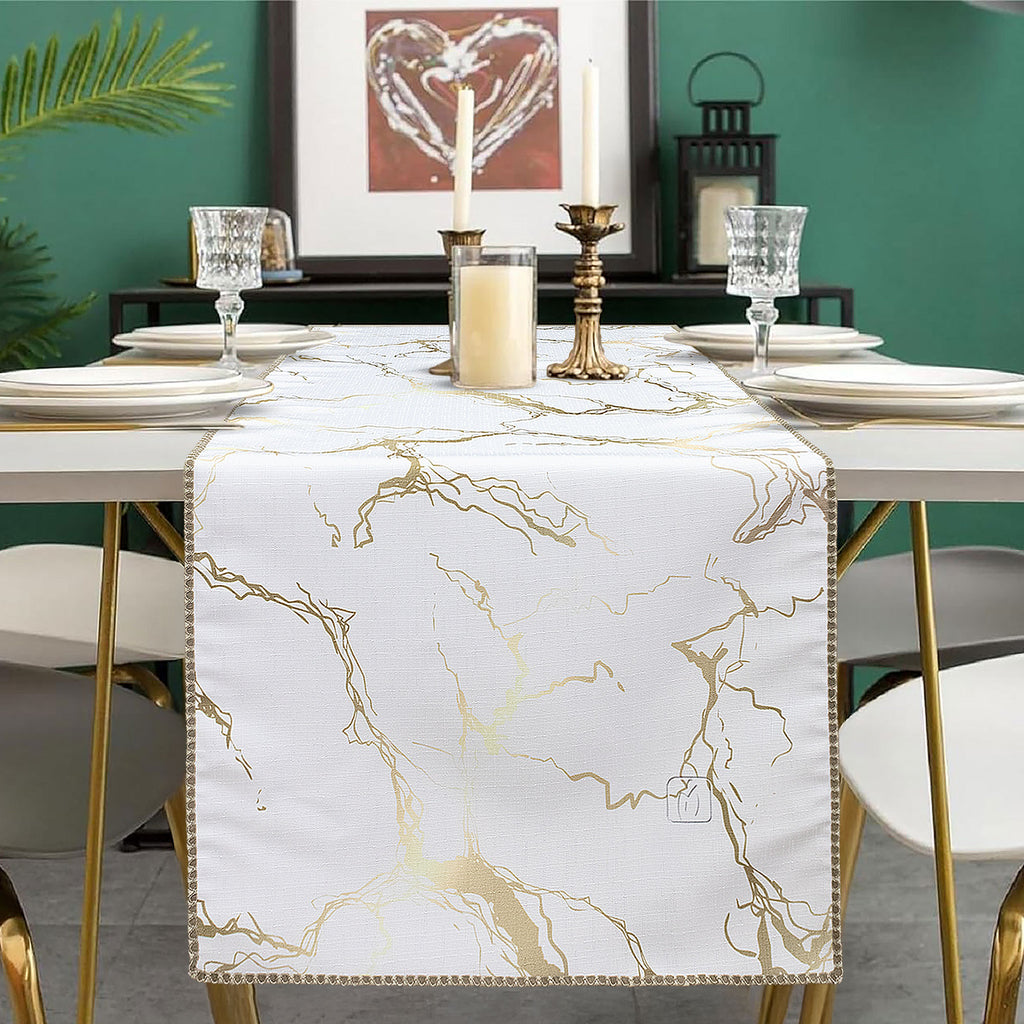 Add a touch of elegance to your table with our marble effect runner. The high definition digital print faithfully reproduces the golden veins of marble, creating a refined and modern look, perfect for any environment.