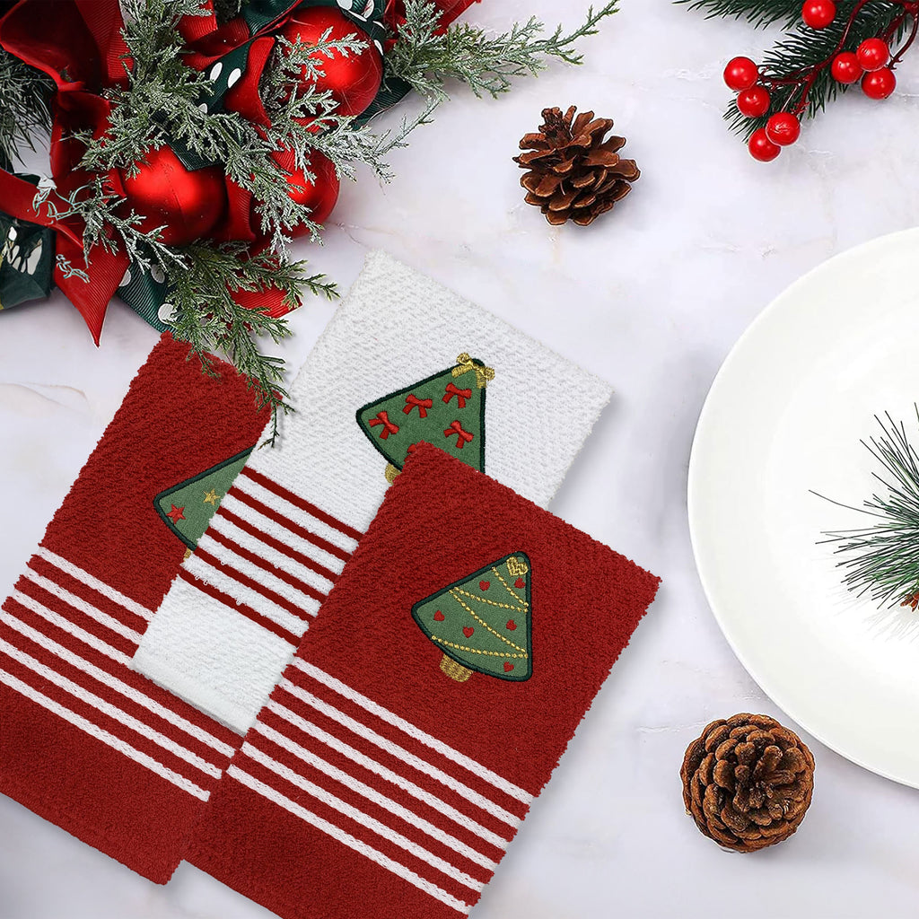 The set consists of three tea towels, two tea towels are in red with white stripes, decorated with enchanting little trees with embroidered stars and hearts, ready to bring a smile of joy to your every gesture in the kitchen. The third tea towel, in elegant white and red stripes, features a beautifully embroidered Christmas tree with bows, which transmits the festive atmosphere to every corner of your kitchen.