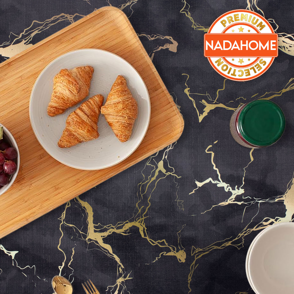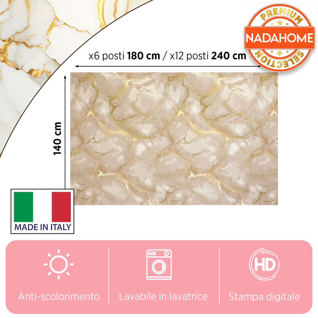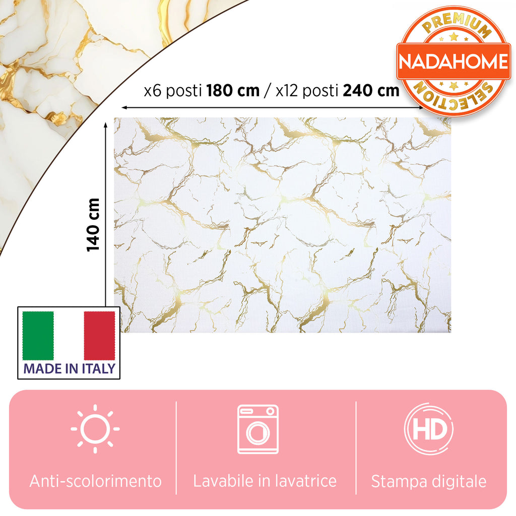 Add a touch of modern elegance to your table with our marble effect tablecloth. The high definition digital print faithfully reproduces the veining of the marble with refined golden details, creating a sophisticated and modern atmosphere.