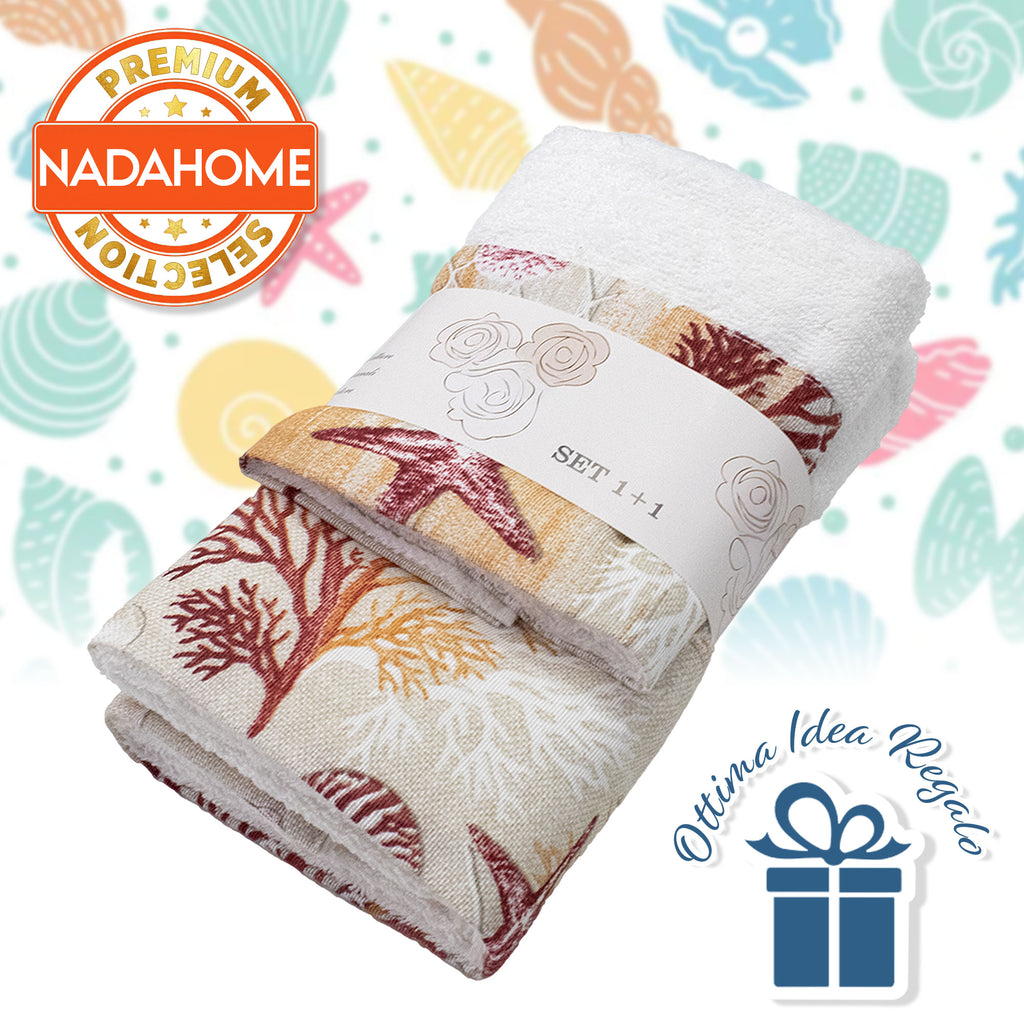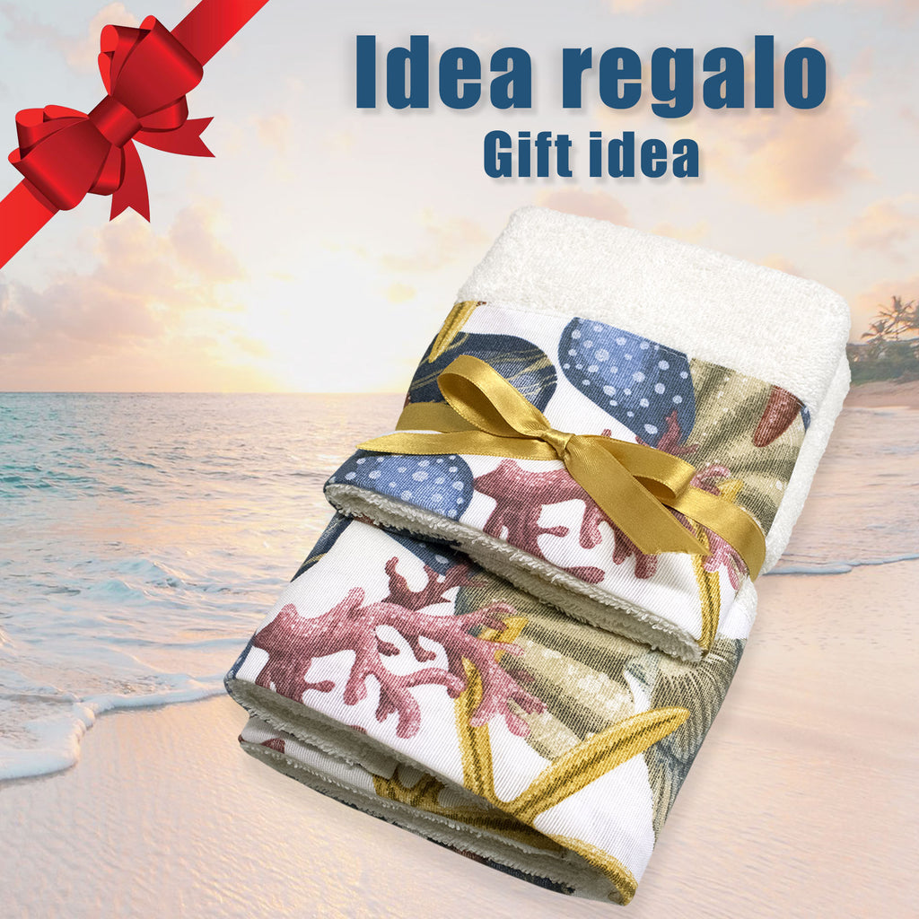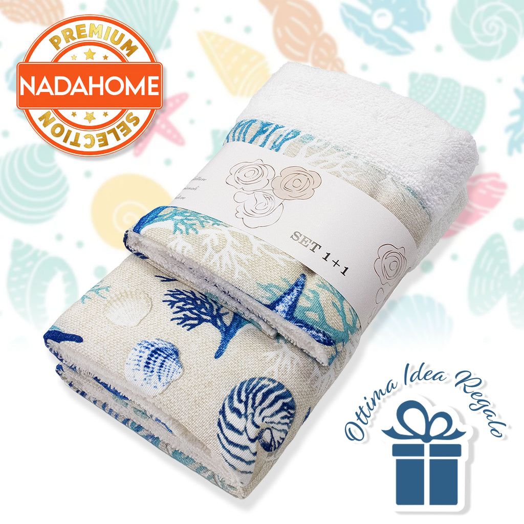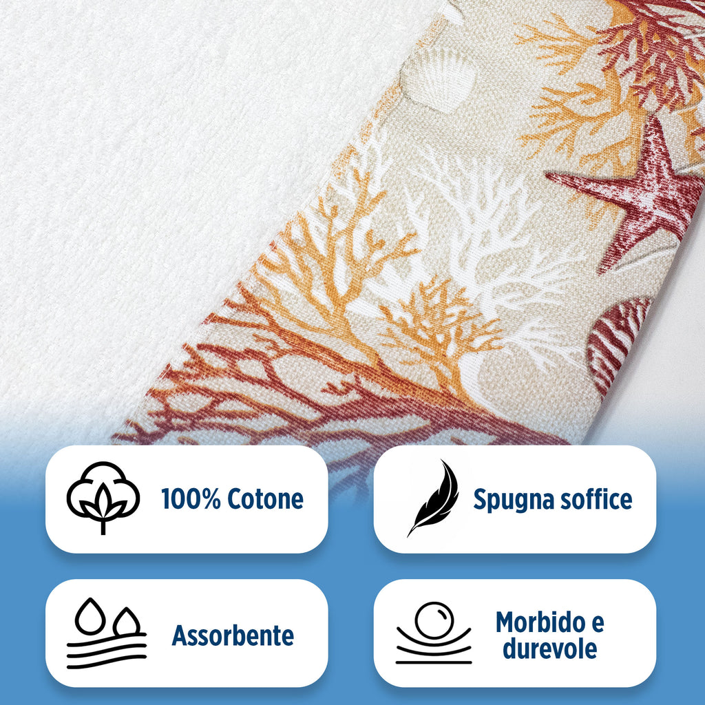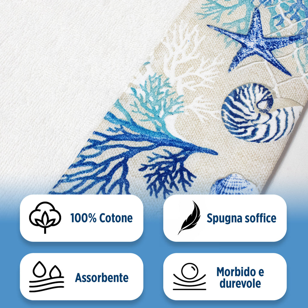 Ogni asciugamano è decorato con affascinanti fantasie marine che evocano il rilassante mondo sottomarino: conchiglie delicate, stelle marine e onde stilizzate che portano un soffio di brezza marina direttamente a casa tua. La qualità della spugna assicura una straordinaria morbidezza e un'elevata capacità di assorbimento, rendendo ogni uso un'esperienza piacevole e confortevole.