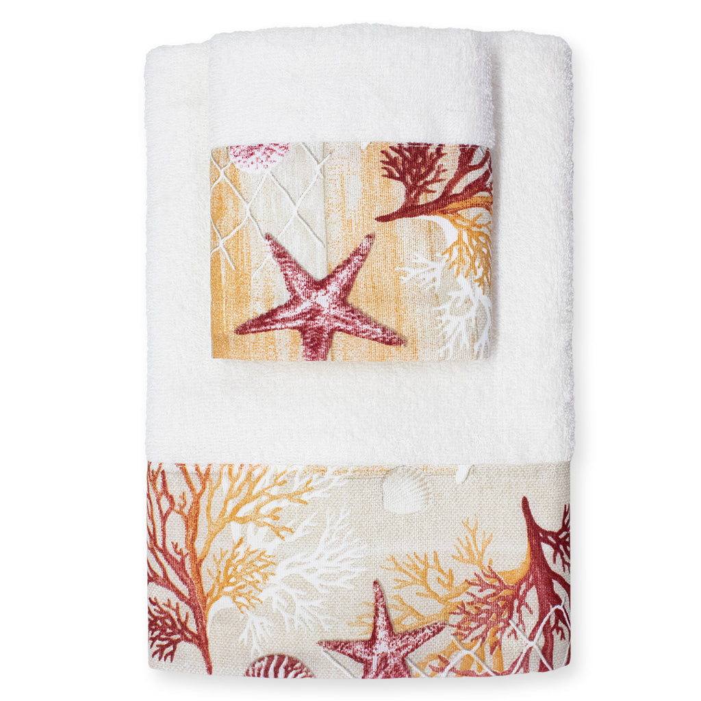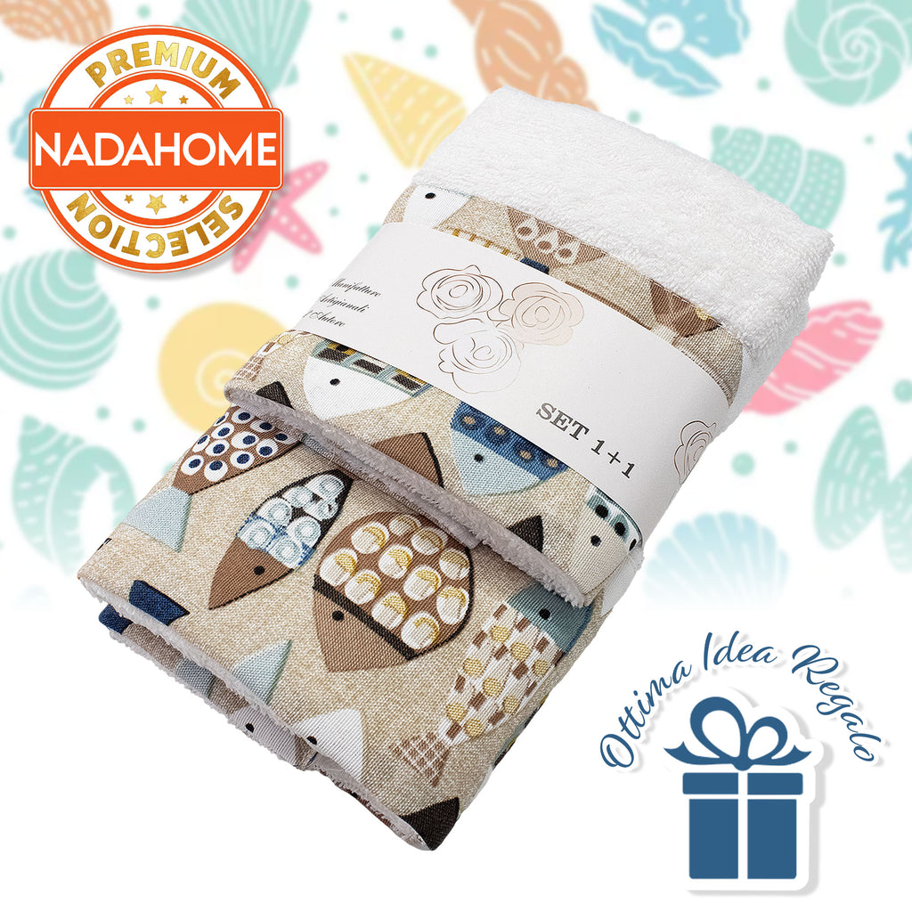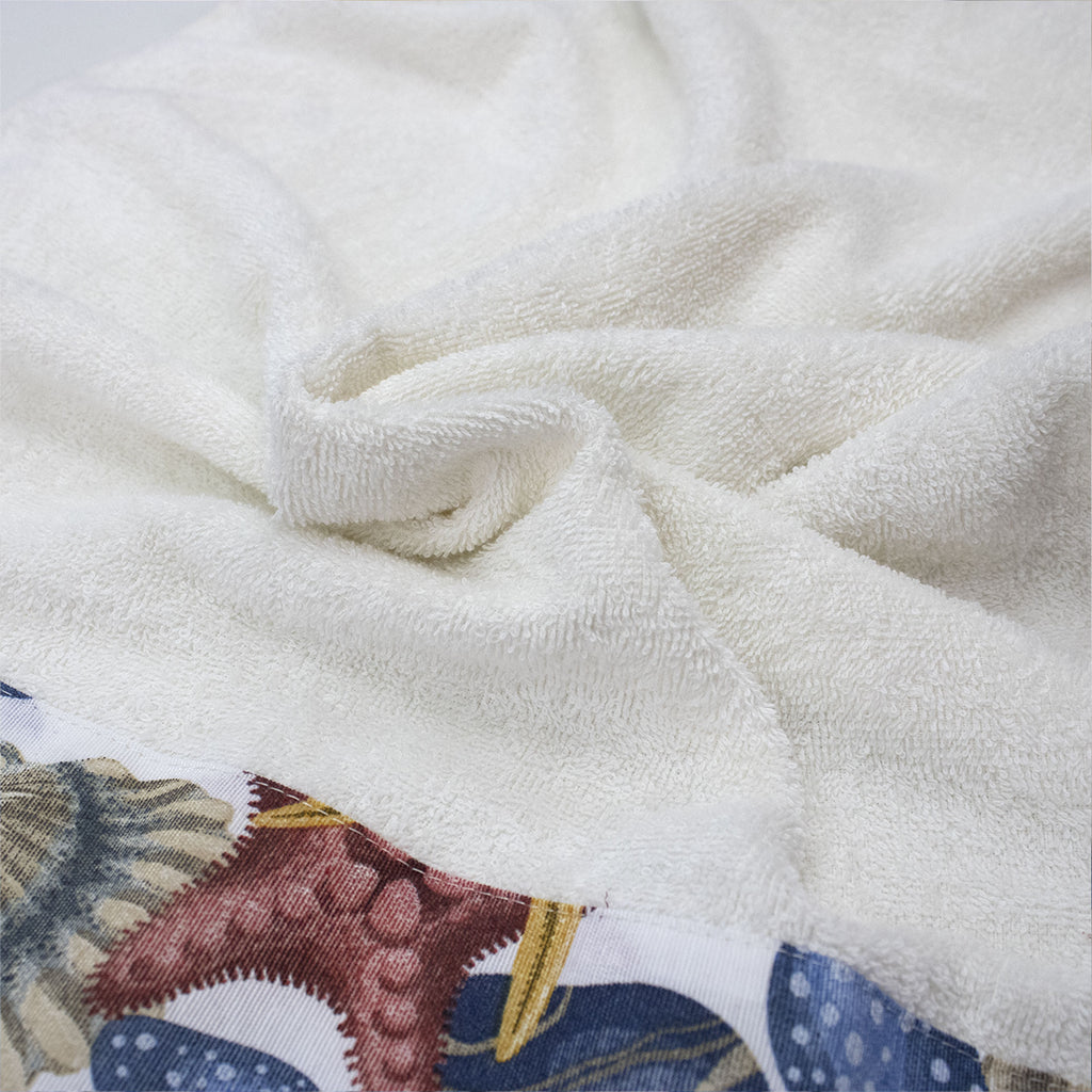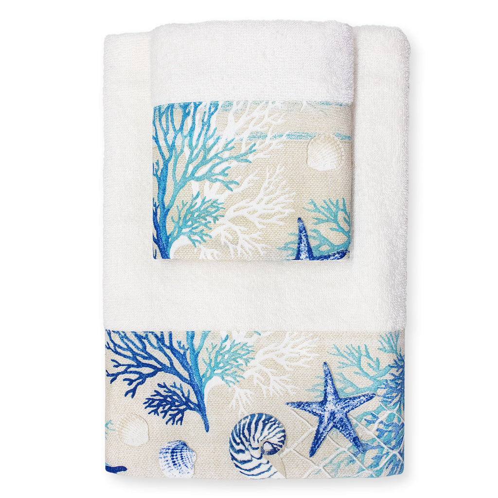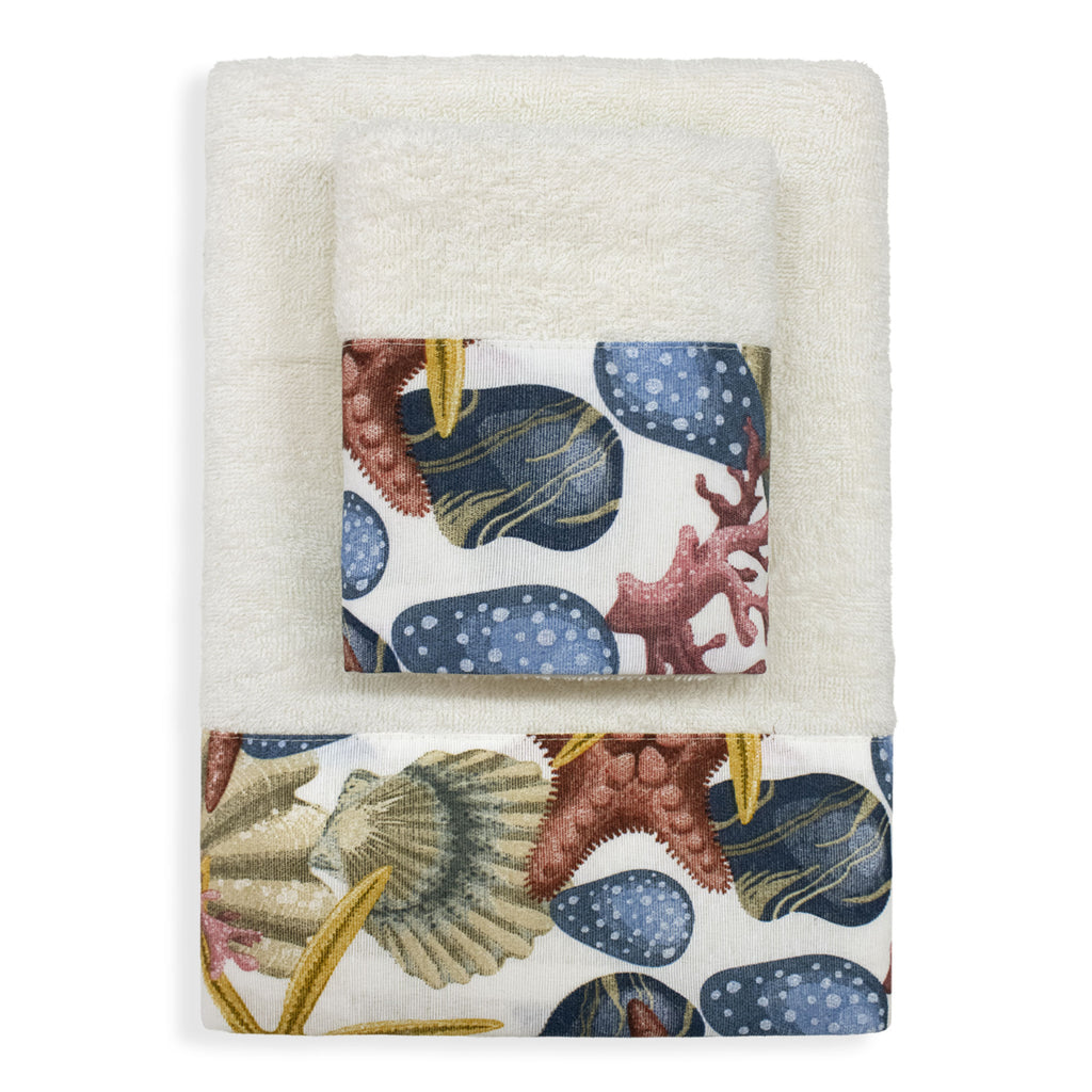 Ogni asciugamano è decorato con affascinanti fantasie marine che evocano il rilassante mondo sottomarino: conchiglie delicate, stelle marine e onde stilizzate che portano un soffio di brezza marina direttamente a casa tua. La qualità della spugna assicura una straordinaria morbidezza e un'elevata capacità di assorbimento, rendendo ogni uso un'esperienza piacevole e confortevole.