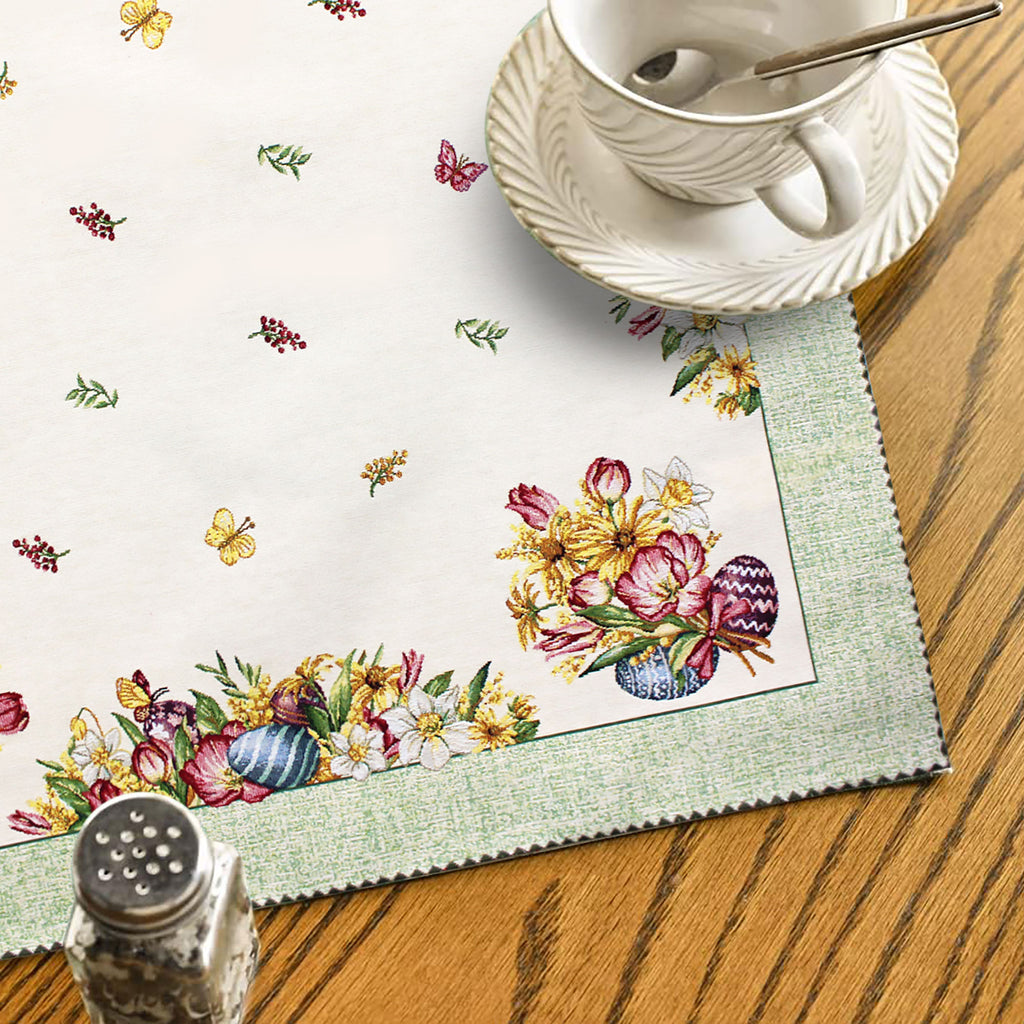 La fantasia incantevole con al centro foglie e farfalle e all'estremità un motivo floreale e uova pasquali aggiunge un tocco festivo e unico alla tua tavola. Ogni dettaglio è curato con maestria, creando un'opera d'arte tessile che cattura lo spirito della Pasqua.