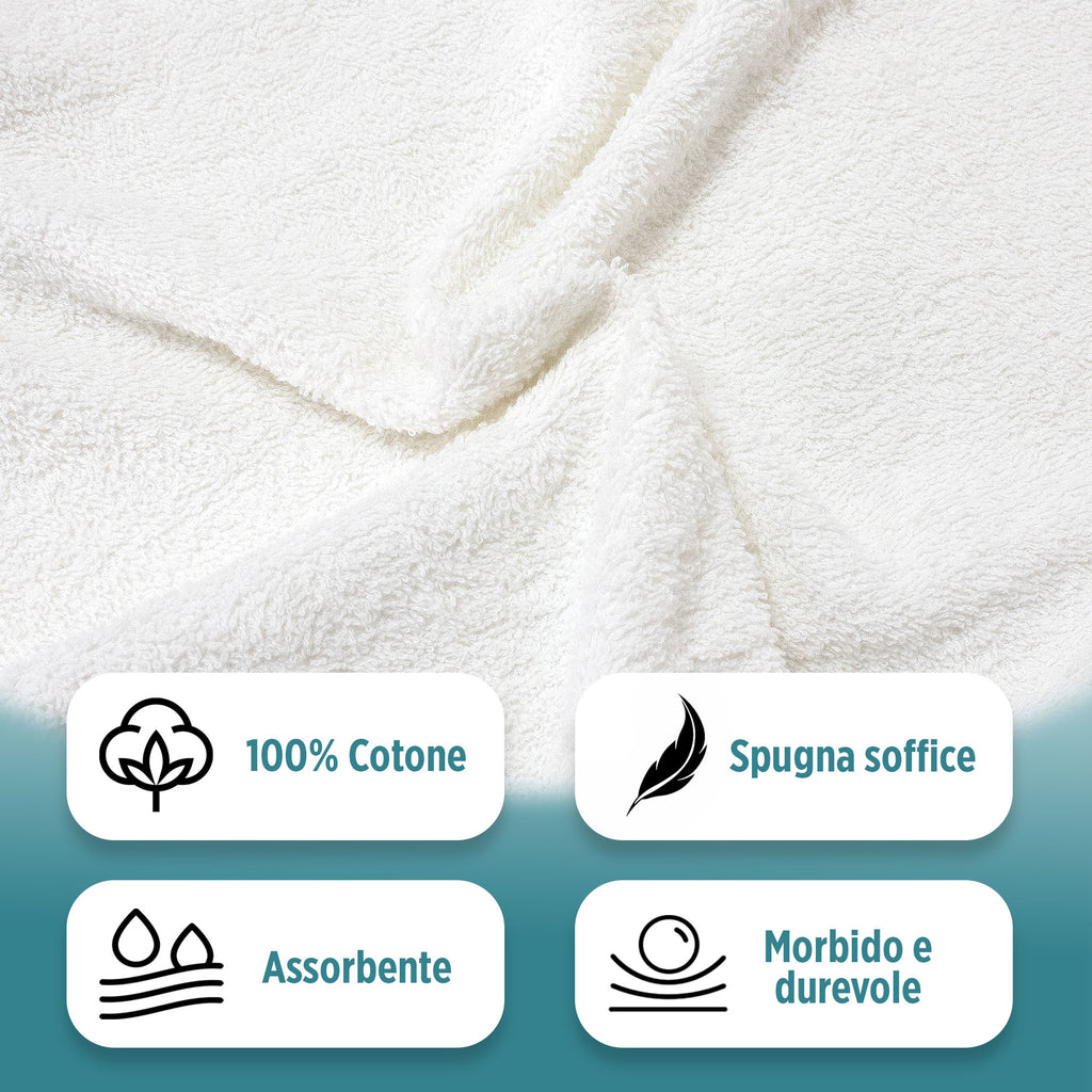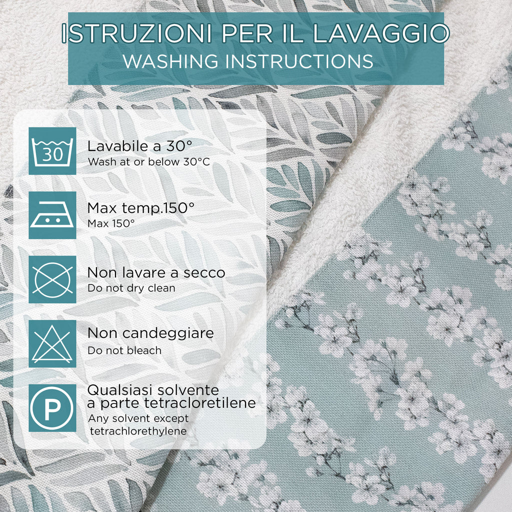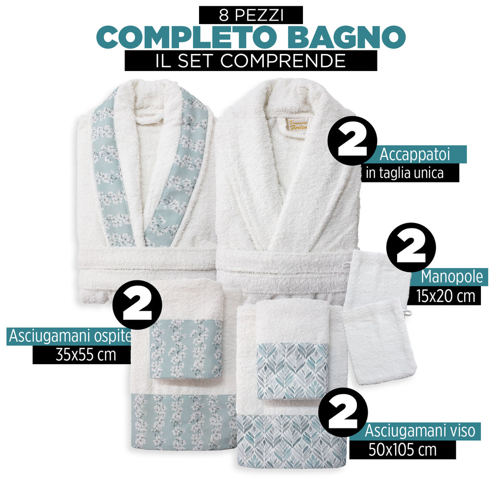 • Dimensioni: 2 Accappatoi taglia unica, 2 Asciugamani viso 50x105cm, 2 Asciugamani Ospiti 35x55cm, 2 Manopole 15x20cm.