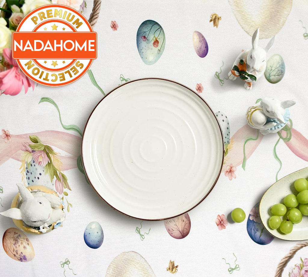 Rendi indimenticabile ogni momento pasquale con il nostro copritavolo in puro cotone, decorato con una raffinata stampa che celebra la stagione primaverile: coniglietti, ceste piene di uova, fiocchi, nastri e delicati fiori si intrecciano con colori pastello e dettagli di uccellini per un’atmosfera elegante e accogliente.