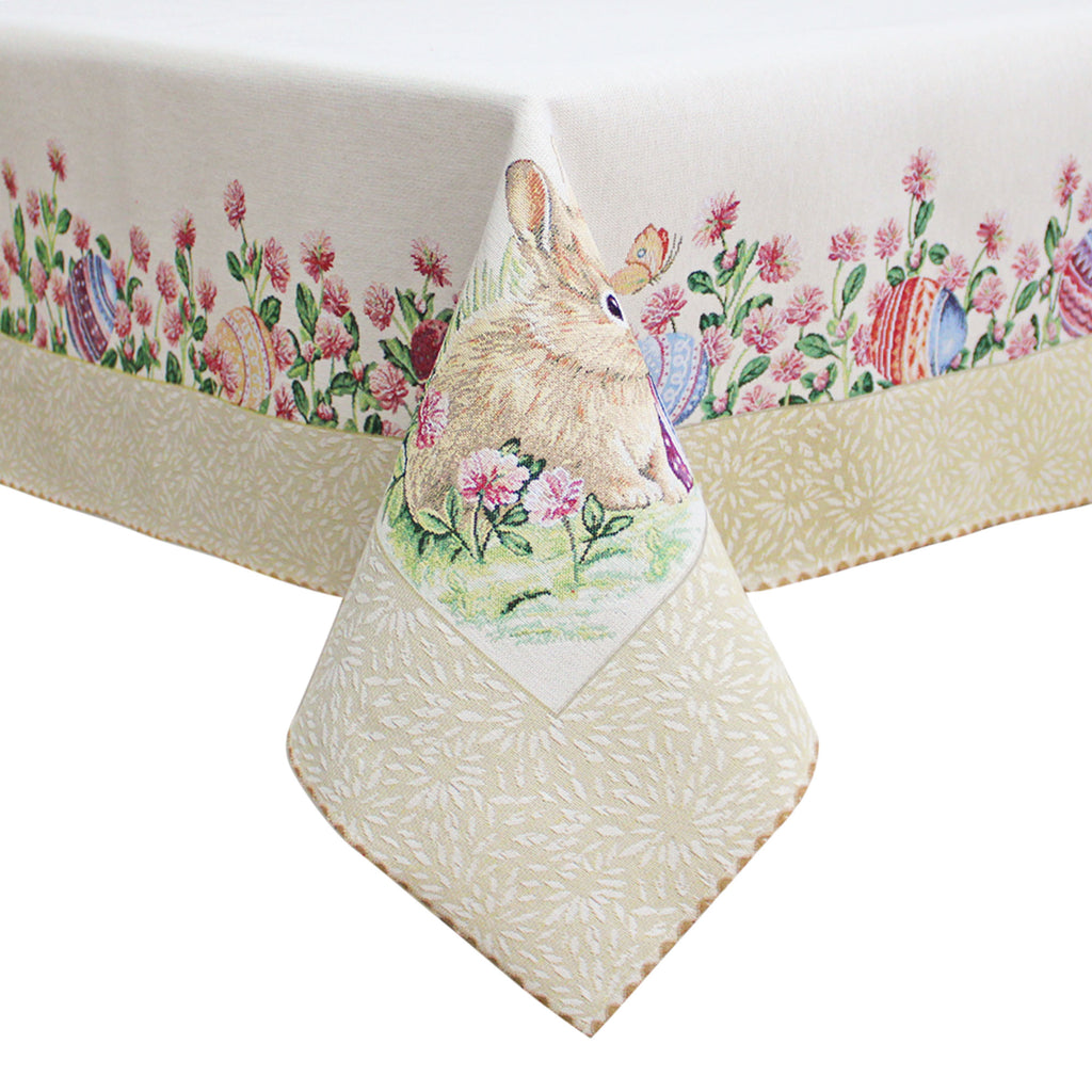 La fantasia incantevole con al centro una corona di fiori e farfalle e tutto intorno conigli giocosi, fiori e uova pasquali aggiunge un tocco festivo e unico alla tua tavola. Con dimensioni generose di 140x180cm, si adatta perfettamente a tavole da 6 posti, trasformando ogni pasto in un'occasione speciale.