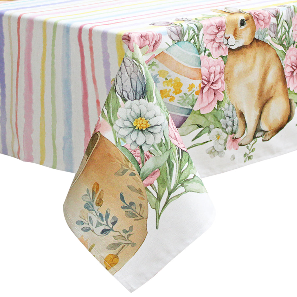 La stampa incantevole con conigli, righe e uova pasquali aggiunge un tocco festivo e unico alla tua tavola. Con dimensioni generose di 140x250cm, si adatta perfettamente a tavole da 12 posti, trasformando ogni pasto in un'occasione speciale.