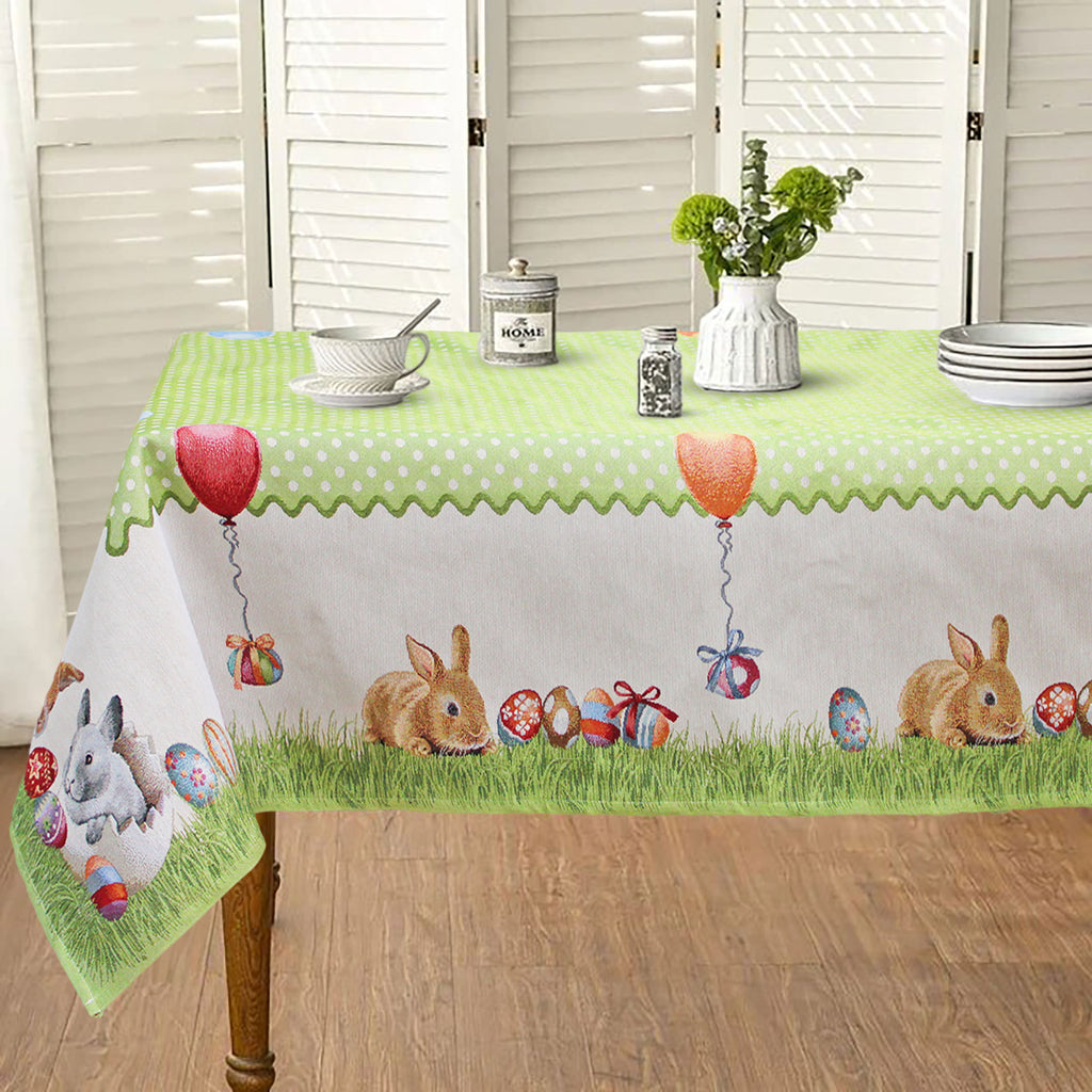 La fantasia incantevole con al centro motivo a pois e intorno conigli giocosi, palloncini e cesti di uova pasquali aggiunge un tocco festivo e unico alla tua tavola. Con dimensioni generose di 140x180cm, si adatta perfettamente a tavole da 6 posti, trasformando ogni pasto in un'occasione speciale.