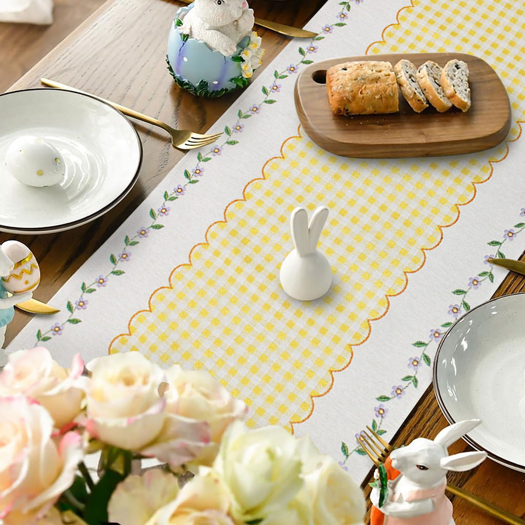 La fantasia giocosa con paperelle e uova pasquali all'estremità, circondate da una cornice floreale e un motivo centrale in vichy, trasforma la tua tavola in un rifugio primaverile. Ogni dettaglio è curato con maestria, creando un'opera d'arte tessile che cattura lo spirito della Pasqua.
