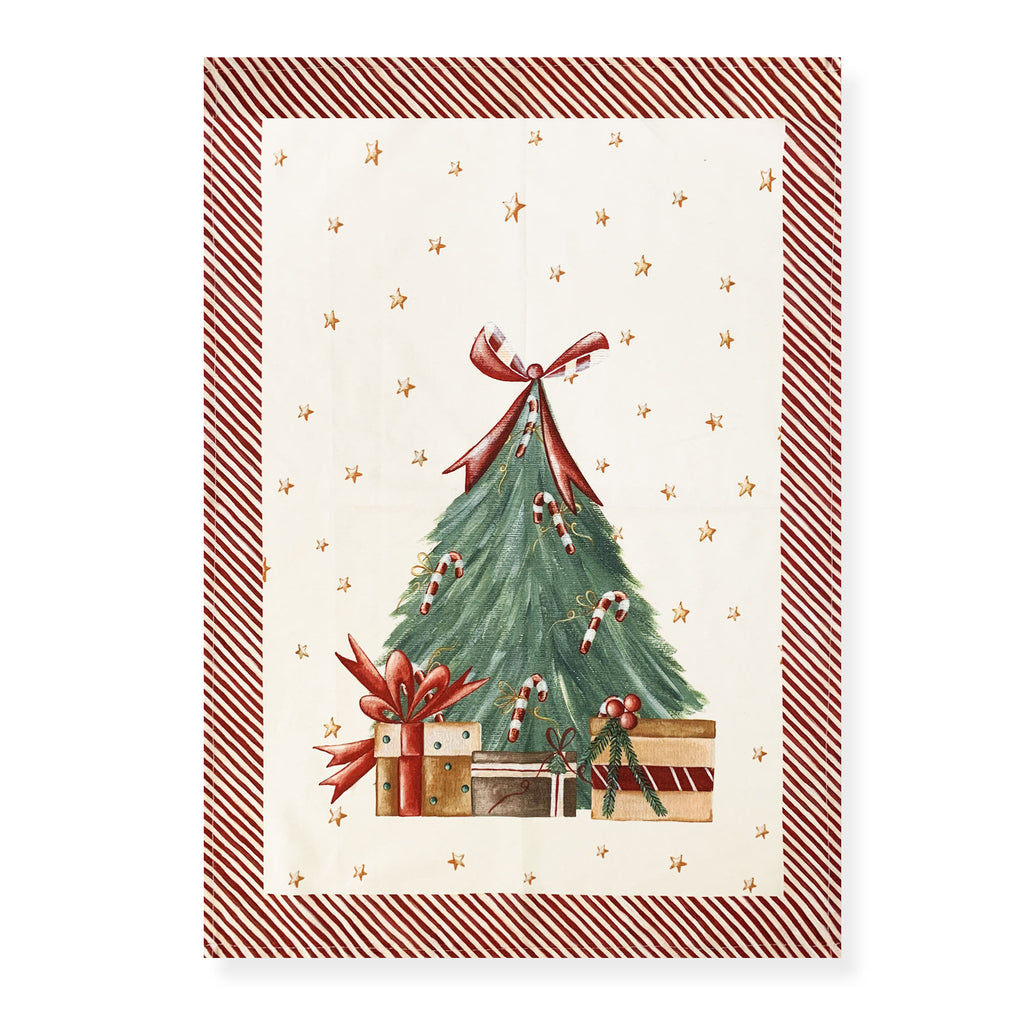 La base color crema offre un'allettante tela per il design natalizio. Il bordo a righe rosse aggiunge un tocco di eleganza e tradizione, mentre al centro spicca un Albero di Natale magnificamente decorato con pacchi regalo, con un fiocco rosso in alto e un fondo di stelle dorate. Questa disposizione incantevole cattura perfettamente lo spirito del Natale.