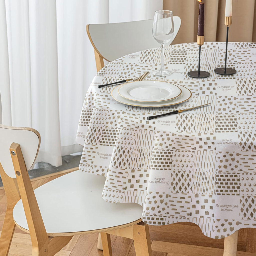 Aggiungi stile e praticità alla tua tavola con la nostra tovaglia antimacchia rotonda. Il design geometrico presenta una composizione armoniosa di quadrati, rettangoli e linee diagonali, creando un effetto moderno ed elegante. Alcuni riquadri riportano la frase "Si mangia con le mani", aggiungendo un tocco di originalità e ironia al tuo ambiente.