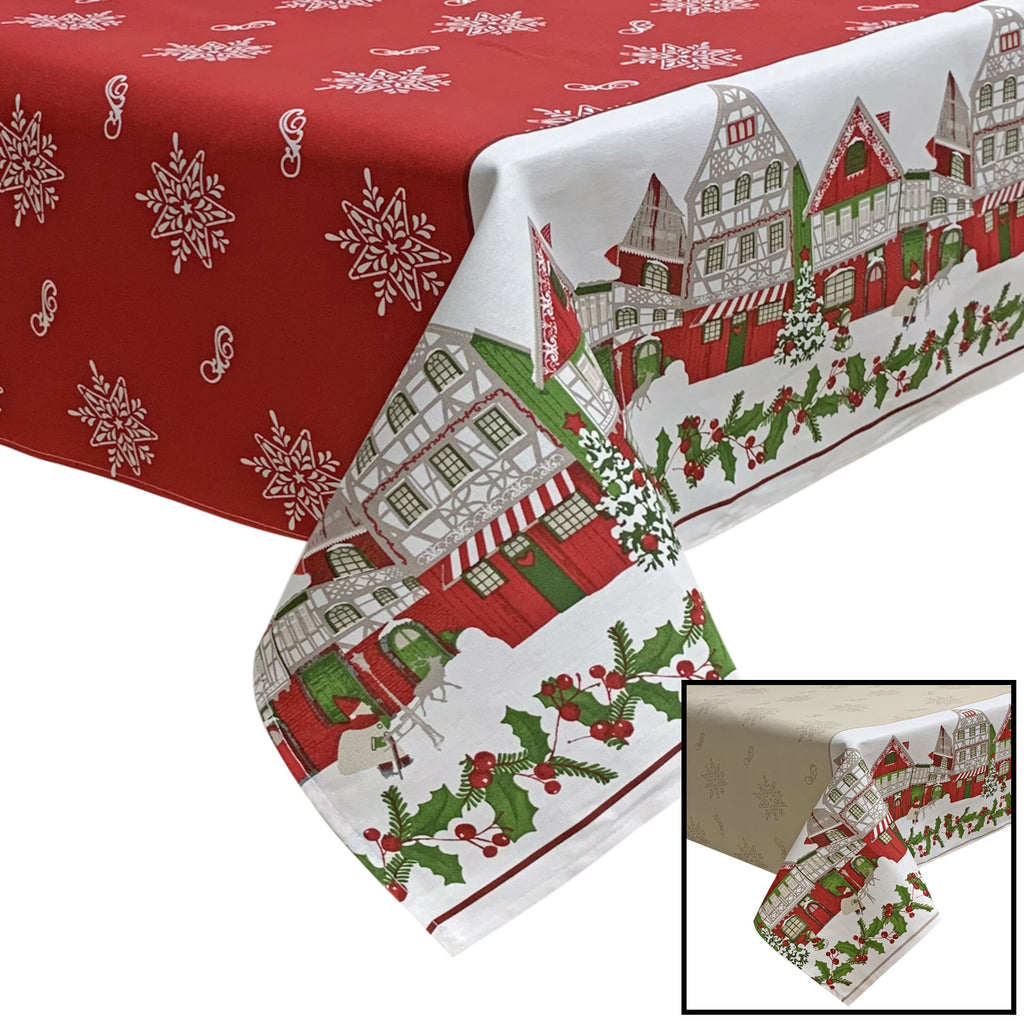 La tovaglia da 140x180cm è realizzata in resistente panama stampata, con una trama di 180gr/mq che la rende perfetta per l'uso quotidiano. La stampa con motivi natalizi aggiunge un tocco di festa all'ambiente.