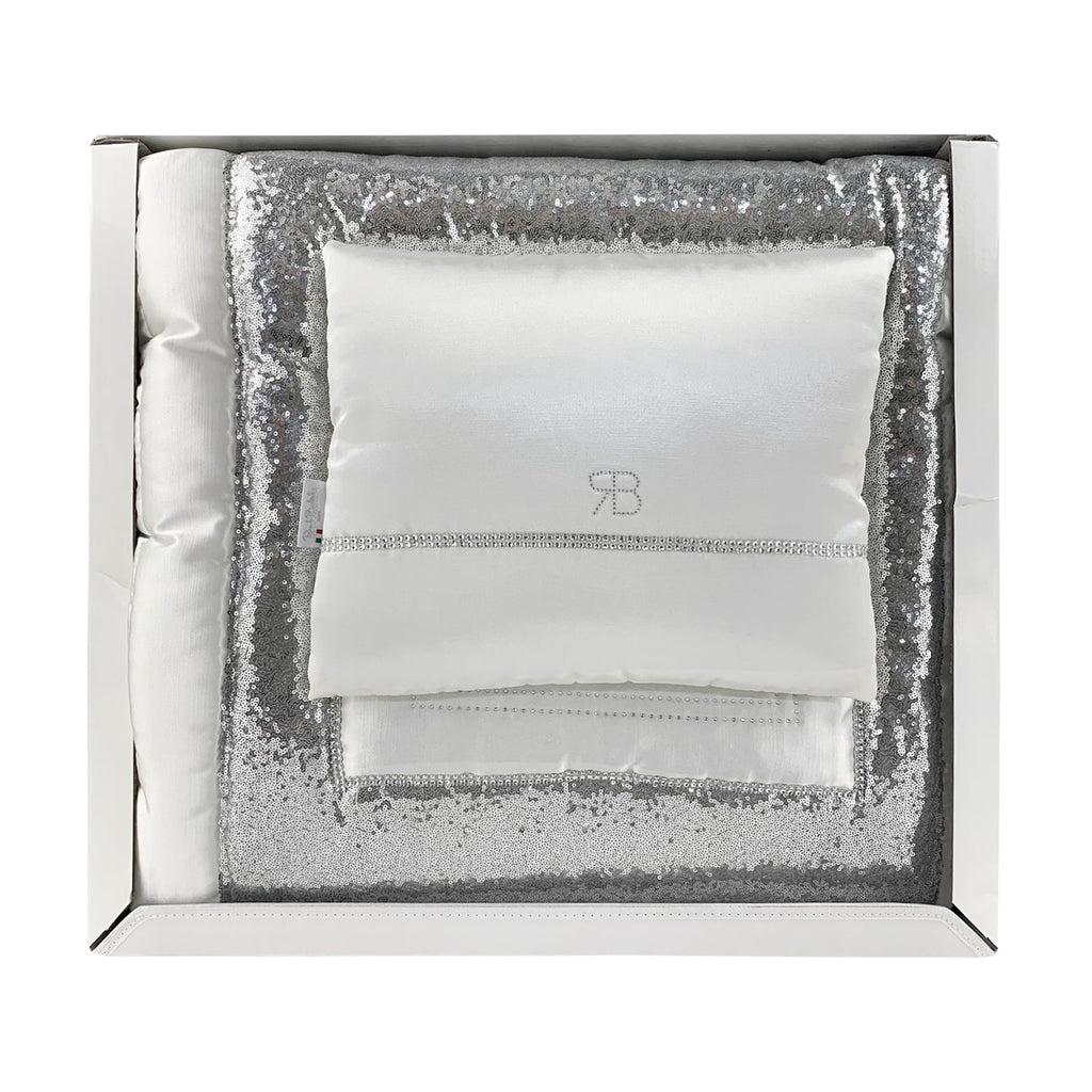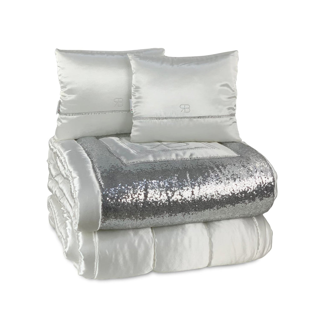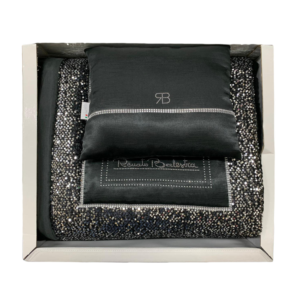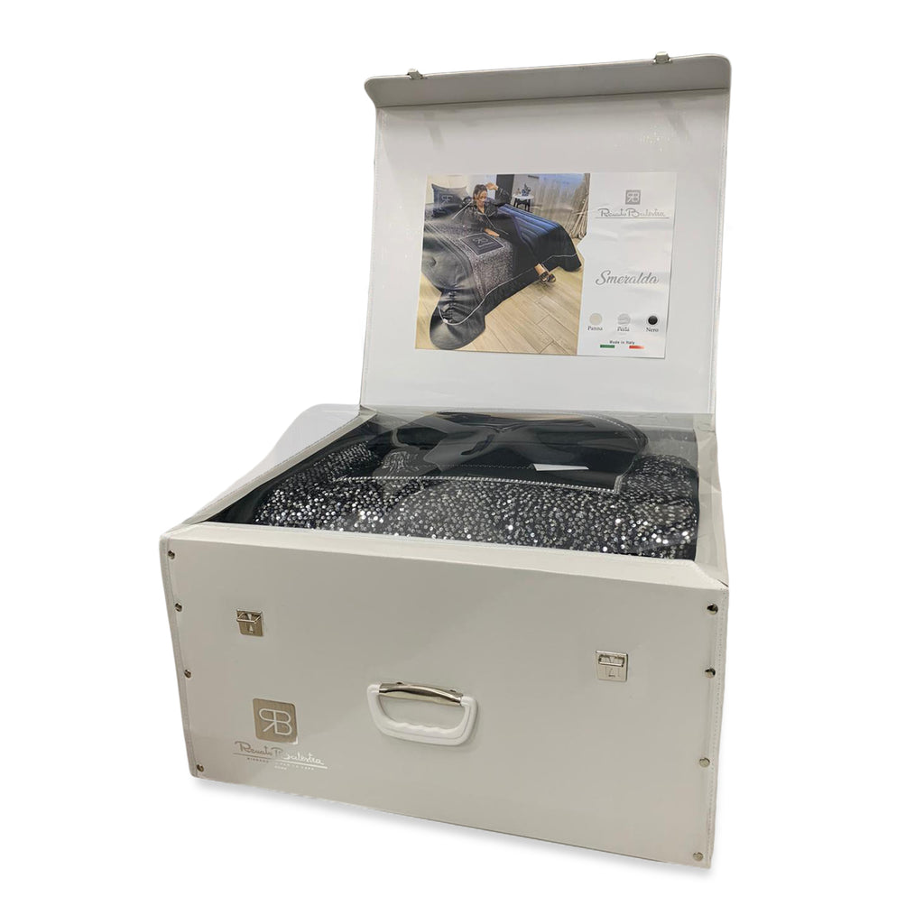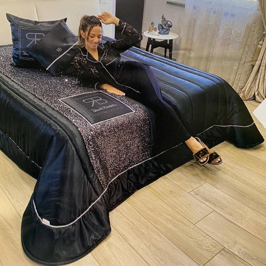 La trapunta Smeralda con il suo tessuto in raso di poliestere con inserti, brillantini e strass, rende un effetto luminoso adatto ad un ambiente elegante.